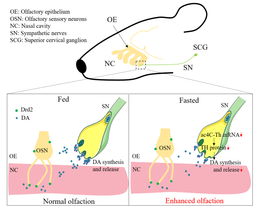 为什么人们在饥饿时会觉得饭菜更香?这是因为一定时间的禁食会增强嗅觉功能。人和动物在饥饿时嗅觉增强有助于觅食,这对进化过程中物种的生存尤为重要。我们的研究结果发现,饥饿时,小鼠鼻腔中多巴胺合成减少,对嗅觉功能产生去抑制,引起嗅觉敏感性增加。更有意思的发现是,鼻腔给予正常小鼠6-羟基-多巴胺,损毁支配鼻粘膜的交感神经末梢,降低鼻腔内多巴胺的来源,可以使正常小鼠的嗅觉能力提高到饥饿小鼠的水平。这些结果证明,饥饿时小鼠鼻腔中多巴胺合成减少可能是饥饿导致嗅觉能力增强的重要机制之一(图4)。