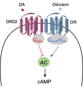 图3:多巴胺通过DRD2抑制气味分子-嗅觉受体的cAMP信号通路