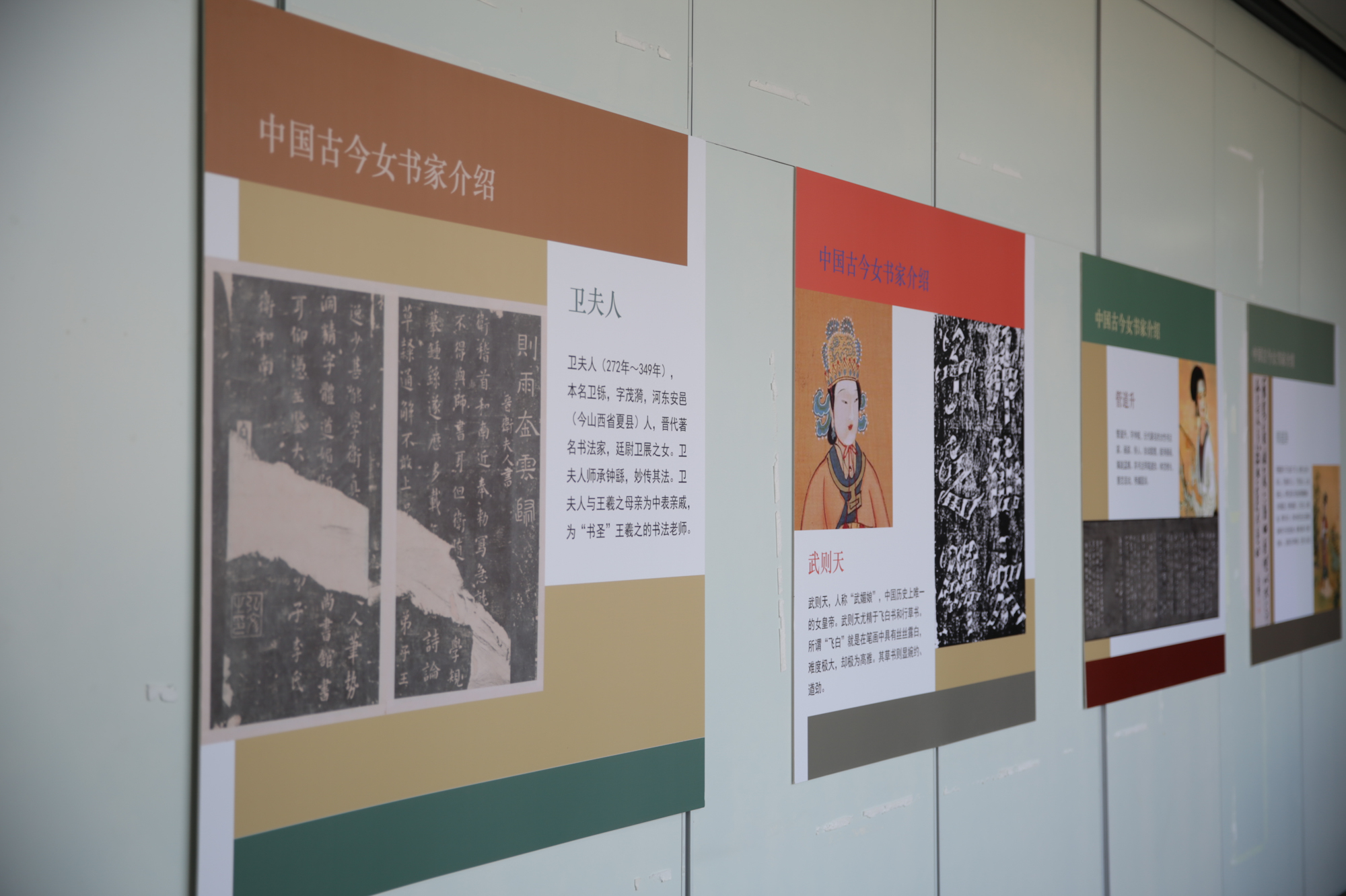 为了配合此展览,展厅中还设置了十个版面对古今女书家进行介绍。从古代的蔡文姬、卫夫人、武则天、管道升到近现代的谈月色、萧娴、游寿、周慧珺等,参观者仿佛穿越古今。主办方介绍,该部分旨在让女书家走进大众视野,向大众普及女性书法的审美趣味,同时激励学子担起传承的重任。