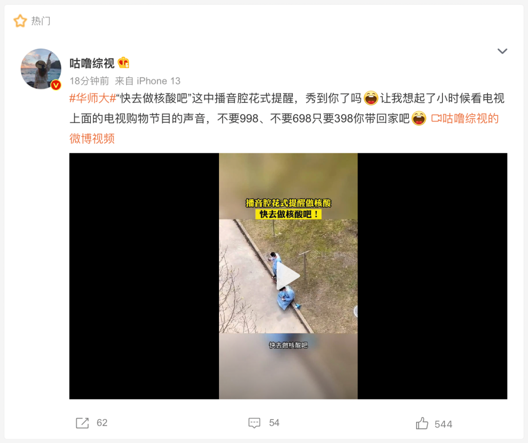 今天有没有被这个声音暖到?这是传播学院2020级广播电视专业研究生韩亚鲁同学在志愿服务时的喊话,纯正花式播音腔。他说希望用这样的方式引起大家注意,尽快集合完成核酸检测,也希望用轻松的表达为大家加油鼓劲!