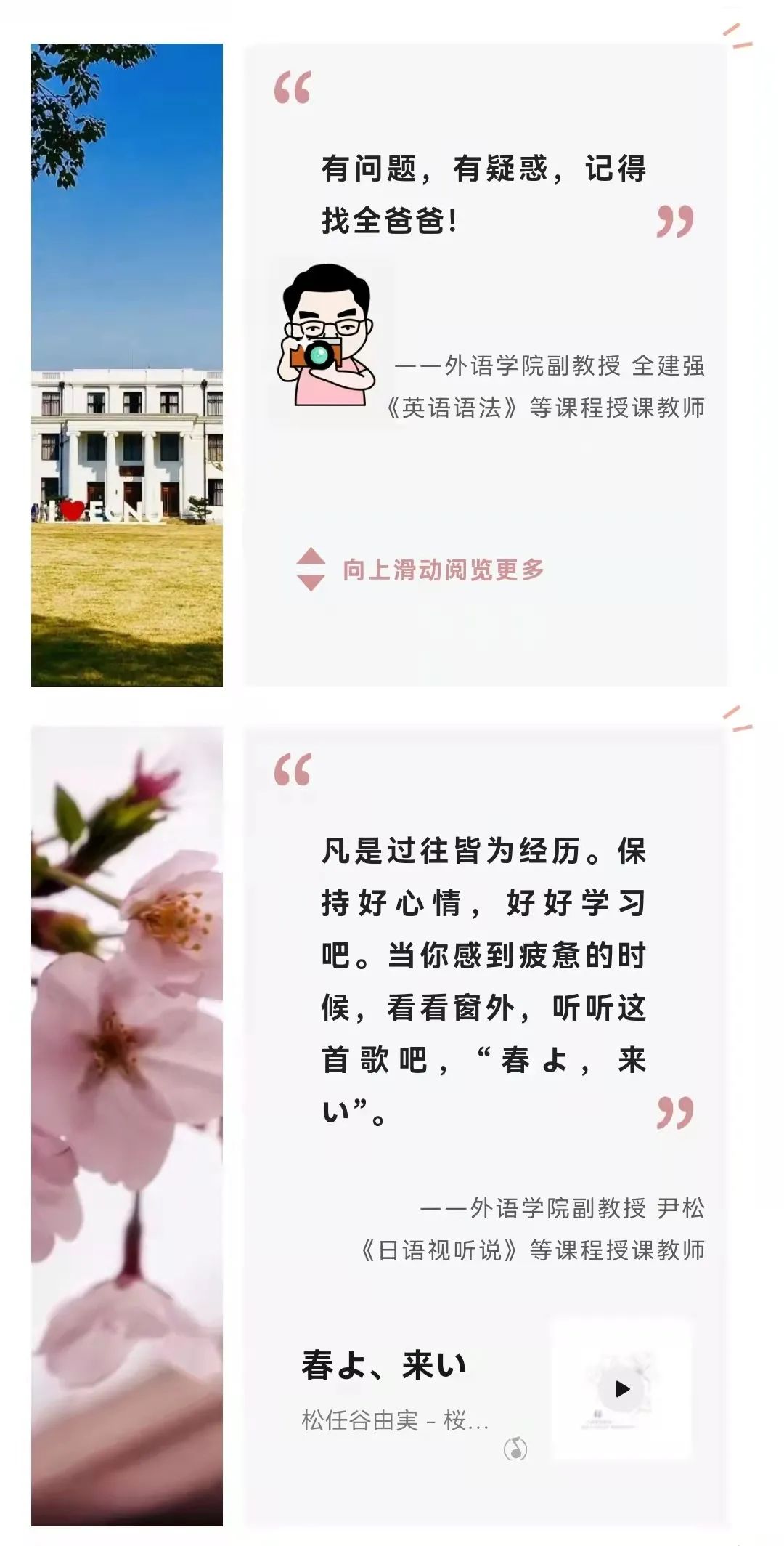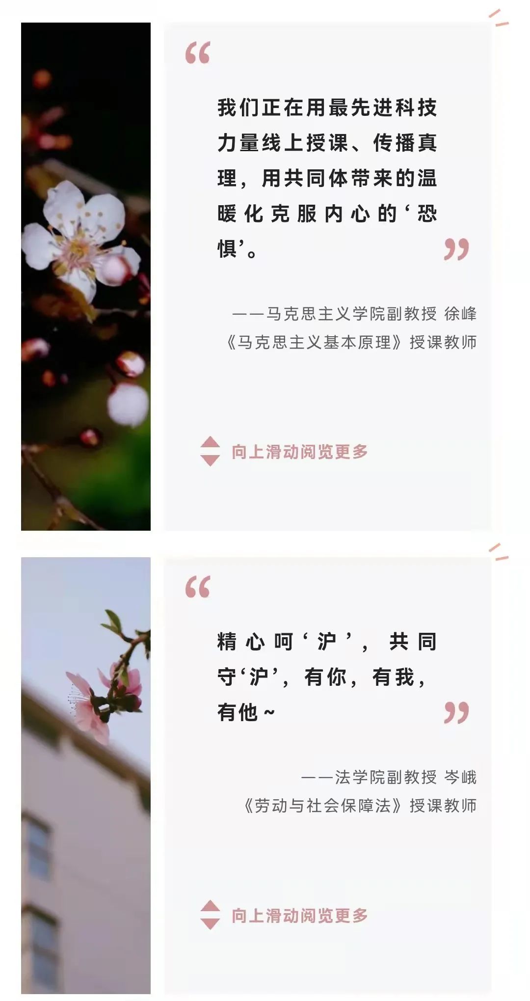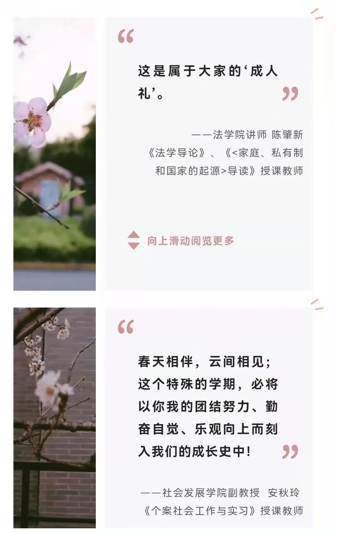 “在岁月的长河里,学会处变不惊将是我们一生的功课。”“我们正在用最先进科技力量线上授课,用共同体带来的温暖克服内心的‘恐惧’。”……这些温暖而有力量的文字,是澳门永利皇宫官网入口学生在线上学习期间收到的老师发来的“云中锦书”。