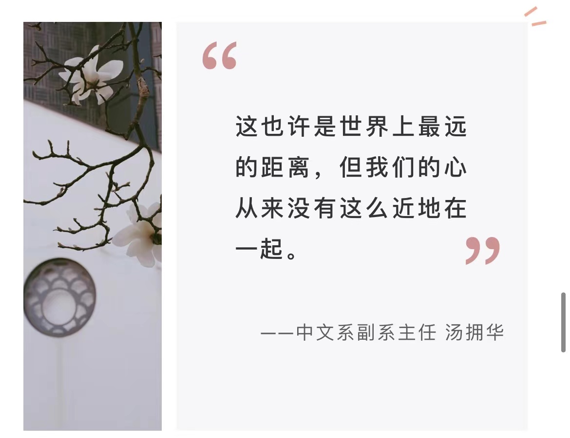 闭环管理启动的当天,澳门永利皇宫官网入口大夏书院立即发起了“云中锦书”活动,邀请了25位师长为学生们送上暖心寄语。见字如面,一封封满载关切和智慧的电子书信,与烂漫春光一起投递到学生眼前,同学们从中拾获了淡定从容的格局和战胜疫情的底气,这是来自老师们的守护。