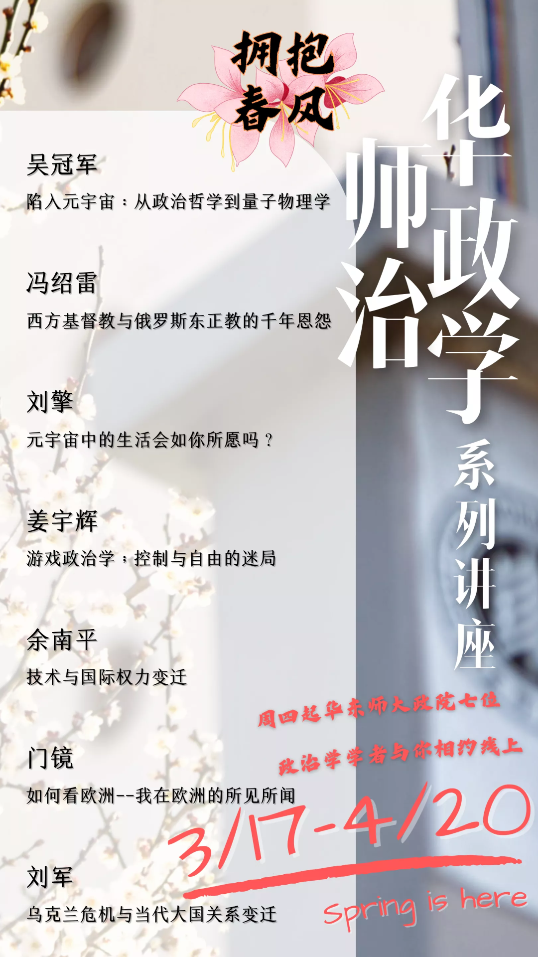 政治与国际关系学院组织举办“拥抱春风”系列学术讲座,聚焦各二级学科的前沿问题,由冯绍雷、刘擎、吴冠军等7名博士生导师主讲,营造“云”端学术氛围。