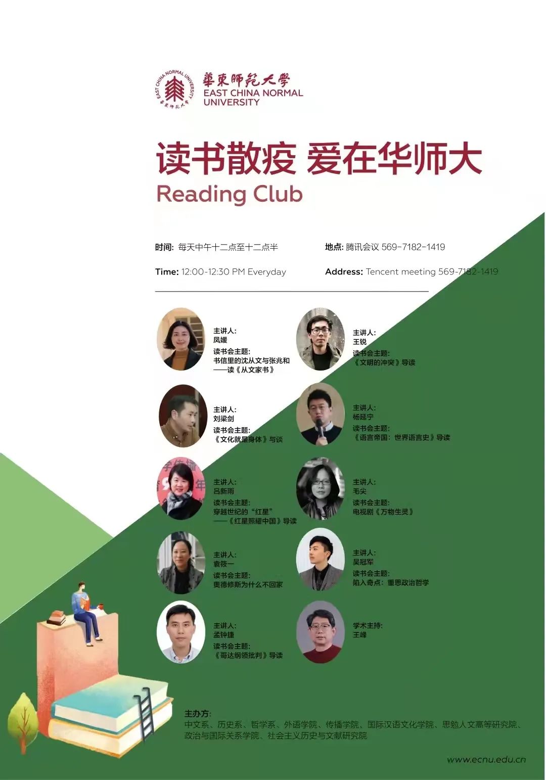 传播学院联合中文系、历史系、哲学系、外语学院、国际汉语文化学院、思勉人文高等研究院、政治与国际关系学院、社会主义历史与文献研究院共同发起“读书散疫,爱在华师大”线上读书会。活动通过腾讯会议平台开展,同时在澳门永利皇宫官网入口、澳门永利皇宫官网入口出版社Bilibili账号直播。广大师生一起用阅读抵抗焦虑,用思考安抚心灵,用沟通温暖孤独。