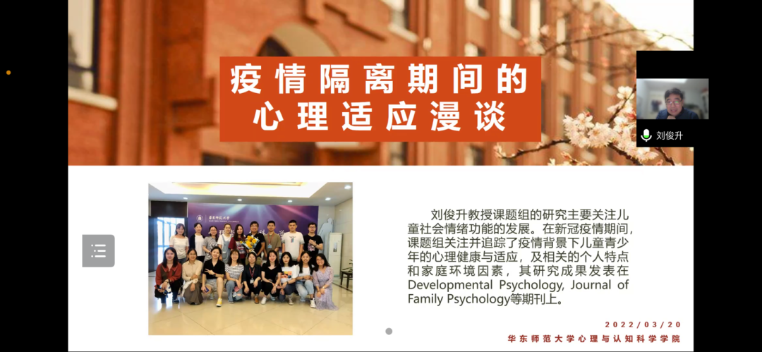 刘俊升教授及其两位研究生针对疫情隔离期间的心理适应开展分享