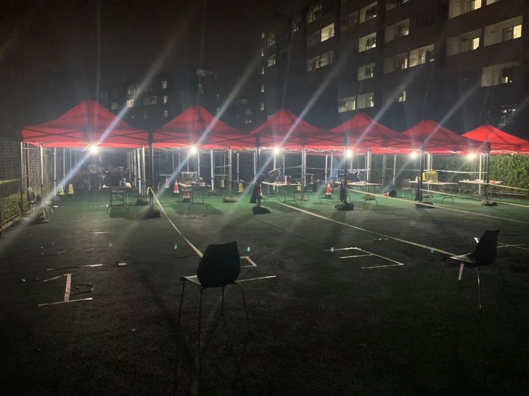 面对多点并发的疫情风险,加快核酸检测速度是关键。根据闵行校区原有的核酸检测采样点,考虑防疫和动线要求,瑞金团队在西操场、本科生公寓、研究生公寓等地重新调整,设定包括备用点在内的6个点位。连夜,与华东师大多部门联手,调整搭建采样棚、配设电源、测试网络环境,以双向奔赴的速度,一夜成军。