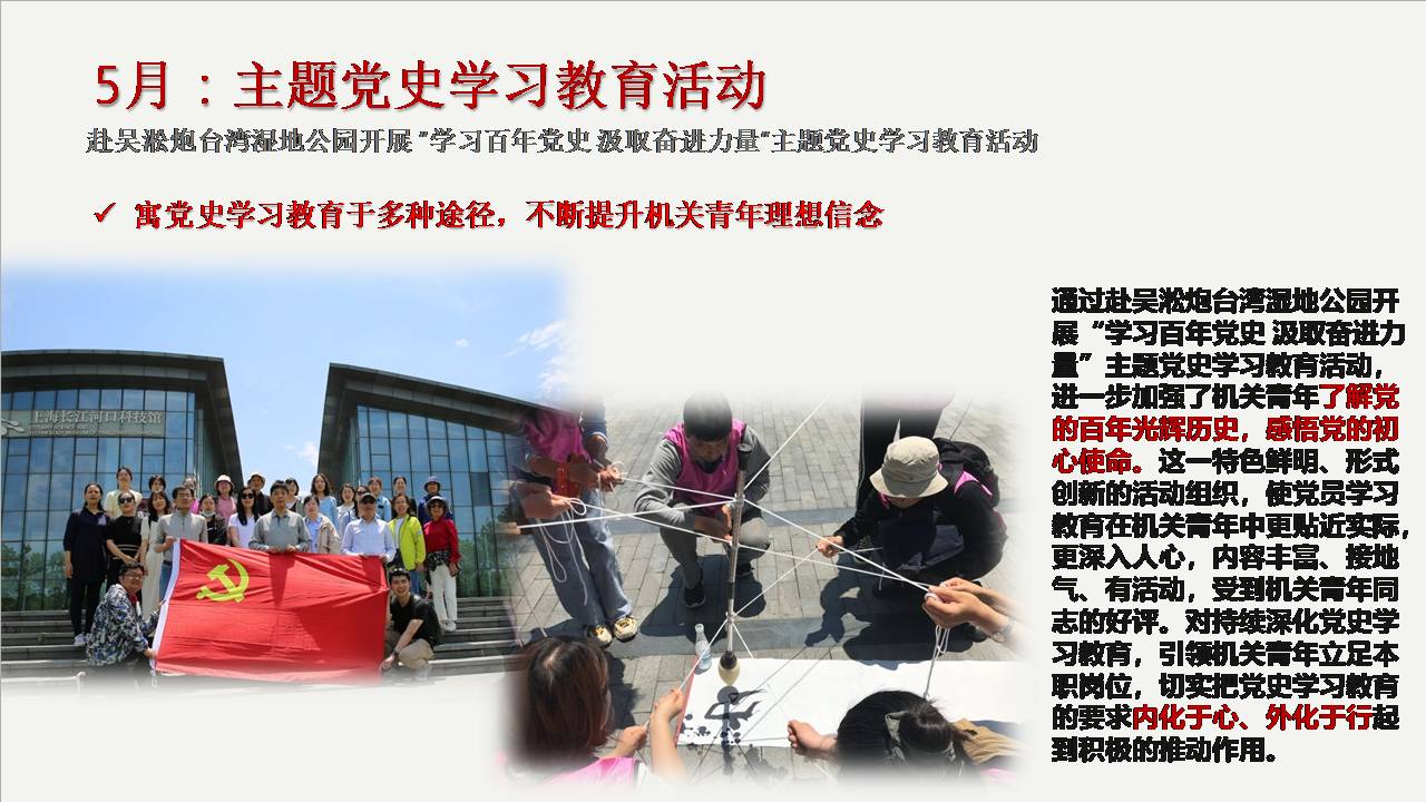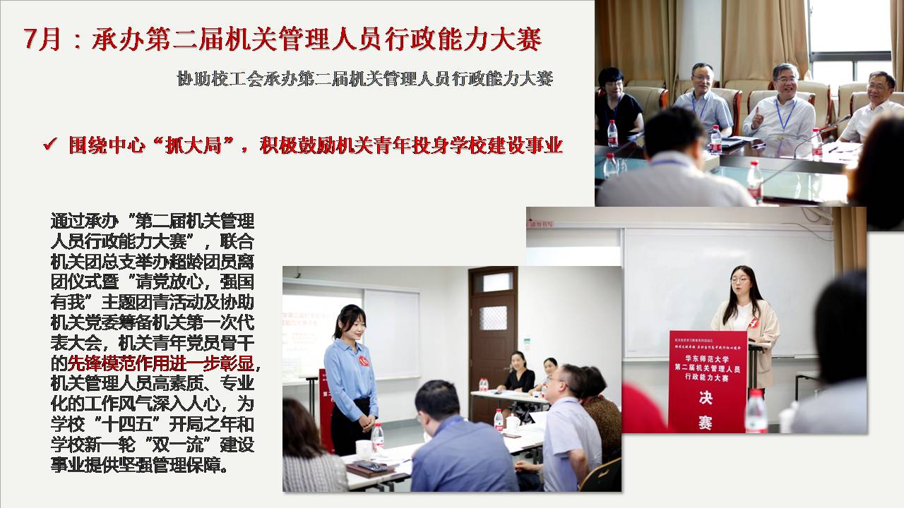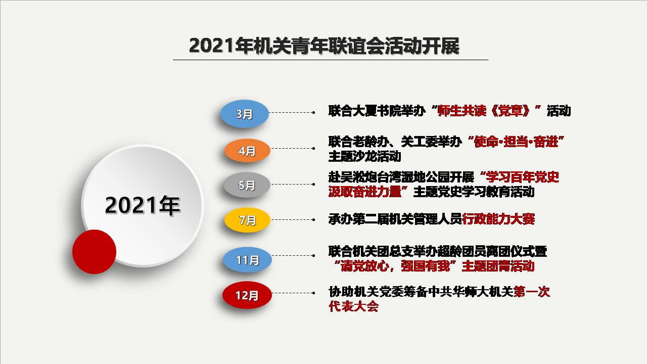 机关青年联谊会紧紧围绕学校“迎双庆”中心工作,服务学校发展大局,积极克服疫情对于活动组织的不利影响,成功举办多次机关青年喜闻乐见的主题活动。通过遴选机关优秀青年参与大夏书院的“师生共读《党章》”活动,进一步引导机关青年紧密围绕学校“卓越育人”这一中心工作;通过联合老龄办、关工委举办“使命·担当·奋进”主题沙龙活动,学校原党委副书记罗国振作题为“如何成为一个合格的高校管理人员”主题报告,以老同志传经送宝、青年同志经验分享的方式,进一步促进机关青年积极为学校改革发展贡献聪明才智;通过赴吴淞炮台湾湿地公园开展“学习百年党史汲取奋进力量”主题党史学习教育,进一步加强了机关青年了解党的百年光辉历史,感悟党的初心使命;通过承办第二届机关管理人员行政能力大赛、联合机关团总支举办超龄团员离团仪式暨“请党放心,强国有我”主题团青活动及协助机关党委筹备中共澳门永利皇宫官网入口机关第一次代表大会,进一步彰显机关青年党员骨干的先锋模范作用。