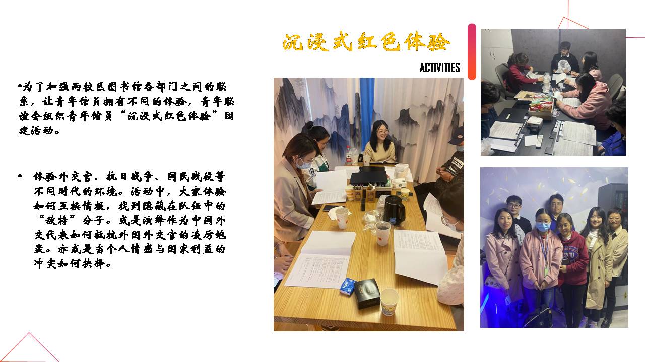 图书馆青年联谊会利用《阅动人生》这一品牌诵读活动串联起学校各个部门的联络,与工会联手提供一个师生展现自我的平台。同时,图书馆青年联谊会开展的活动多样化,除了推荐一些在线讲座以外,图书馆自创的“啡常时光”也提供了一个馆内交流的平台,领导与青年馆员,老馆员与青年馆员,青年馆员与青年馆员之间的学术交流、工作交流以及生活分享。每年组织一场不同形式的团建活动,让青年馆员走出办公室,不仅增进了青年馆员的沟通和交流,也培养和增强了大家的合作精神和集体荣誉感。
