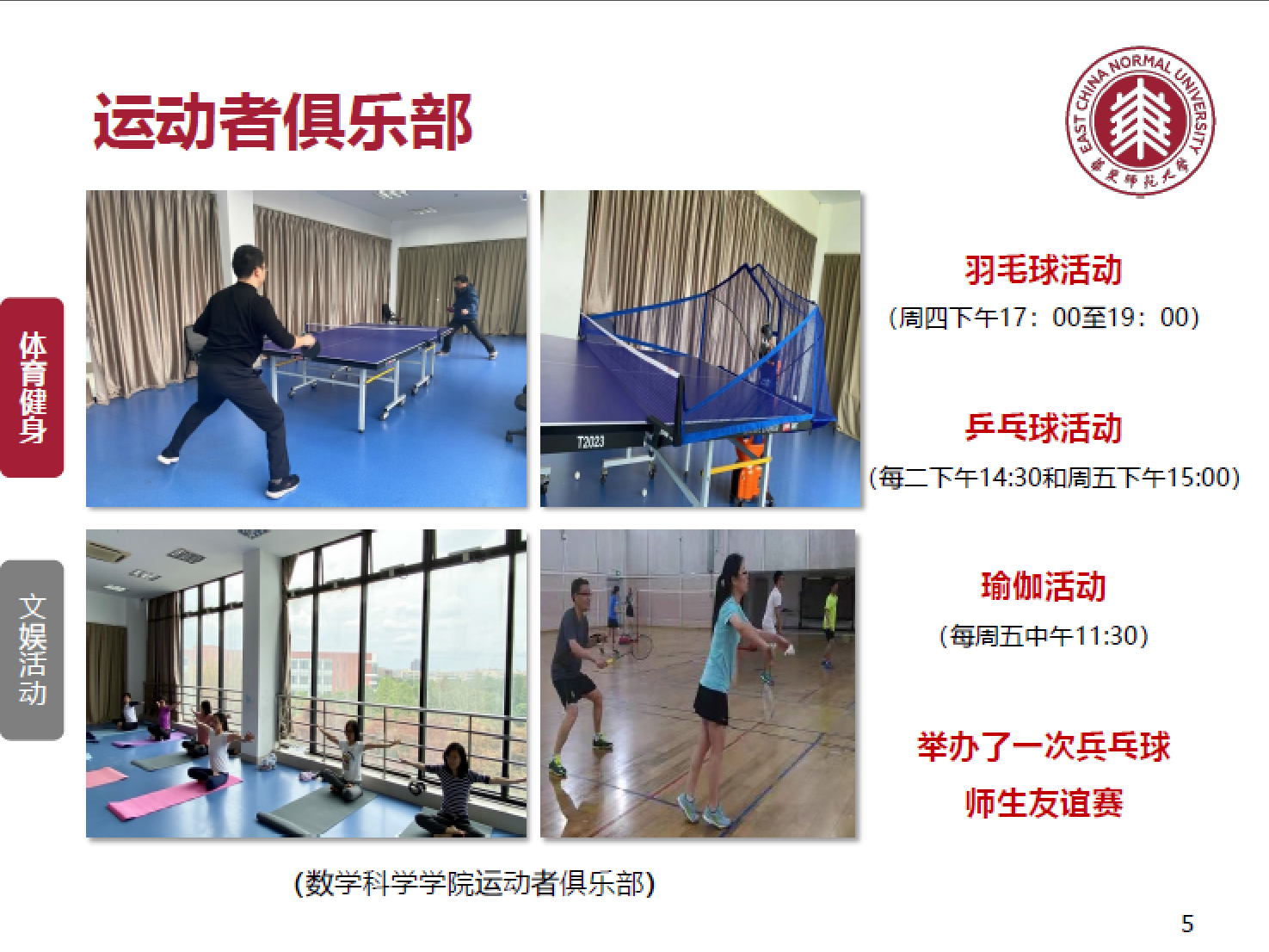 数学科学学院青年联谊会与学院党委、行政、工会相互联动,不定期共同组织青年教师座谈会,畅谈学院与教师发展、教学与科研乃至生活中的一些问题。青年联谊会邀请教学委员会主任庞学诚教授与青年教师分享教学经验,立足于立德树人的根本任务;为了更好地促进青年教师的培养发展,邀请邱瑞锋教授对基金申请书及人才项目答辩进行指导交流,力争培养青年人才。学院的运动者俱乐部,每周一次的定期羽毛球活动、乒乓球活动、瑜伽活动以及各类棋类活动,给教职工生活与工作注入活动。