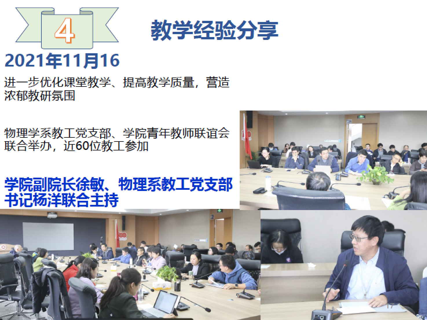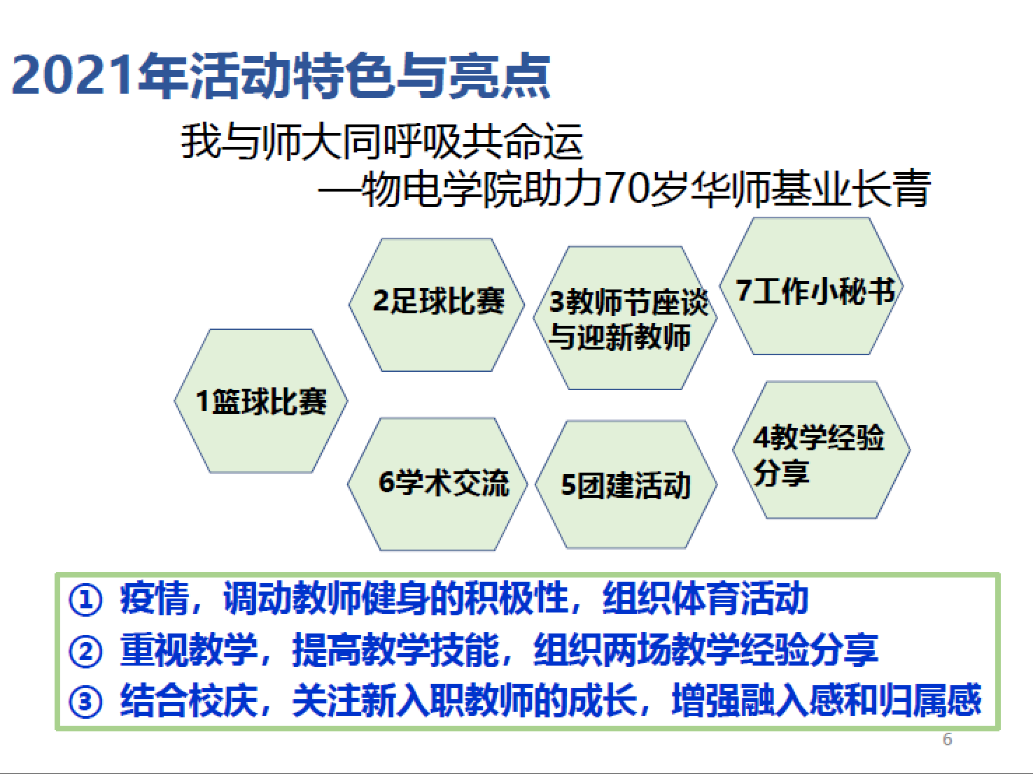 物电学院青年联谊会始终围绕本主题,通过多种形式组织活动,增强青年教师的学校认同感。组织的篮球比赛和足球比赛充分调动了大家健身的积极性,户外素质拓展活动丰富了大家的业余生活,帮助大家在工作之余充分放松身心、锻炼身体,增进情感。在增强体质的同时,组织了新进青年教师学术交流活动、教学座谈会、学术报告等活动,请有经验的教师作课堂教学分享,请海内外新引进的青年教师作交流报告等等,都极大促进了学术交流与合作。