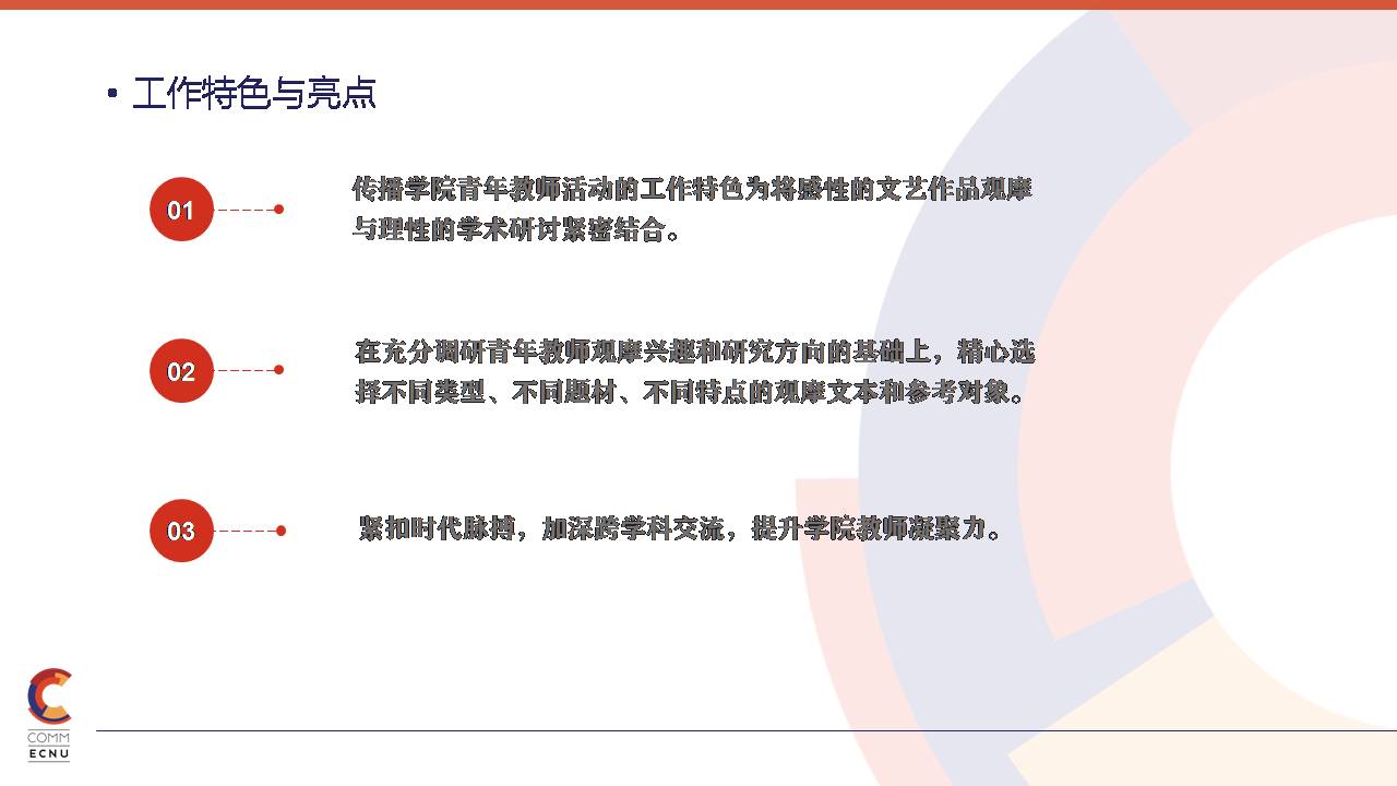 传播学院青年教师活动的工作特色为将感性的文艺作品观摩与理性的学术研讨紧密结合。在充分调研青年教师观摩兴趣和研究方向的基础上,立足于“大传播”平台,精心选择不同类型、不同题材、不同特点的观摩文本和参观对象,通过观摩和研讨新主流文艺作品,透析其海外传播的现状、策略和趋势。紧扣时代脉搏,加深跨学科交流,提升学院教师凝聚力。