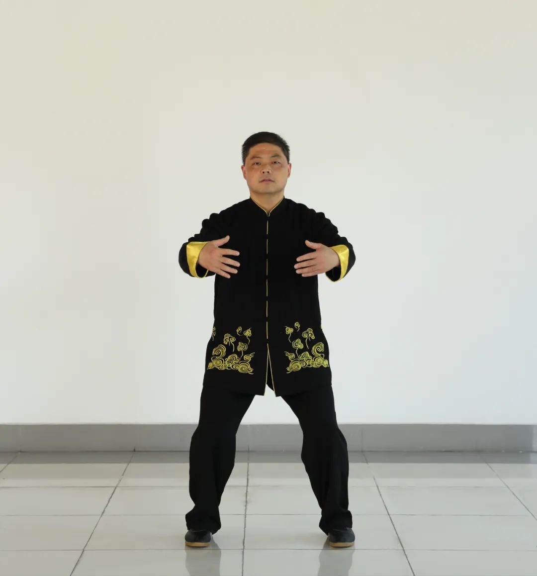 4、肩部松沉,两肩要平。肘要松垂,并有外撑之意。两臂在胸前抱椭圆,指尖相对,掌心朝内,大拇指微微翘起,有领其余四指之意。