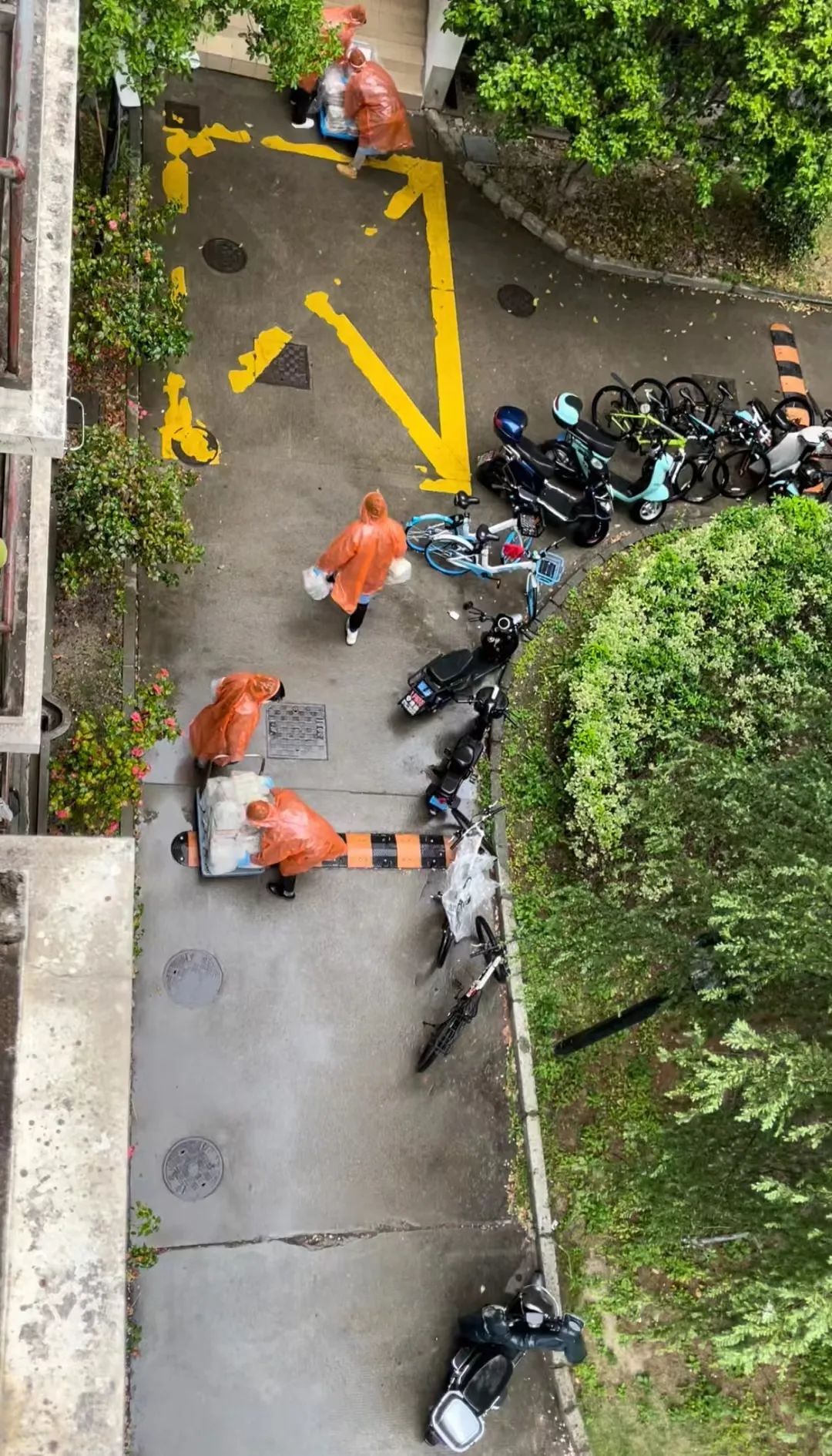 雨水的湿滑,小推车放不稳,大家的手套里也浸满了雨水,依旧照常把三餐配送到同学们手中。同学们也给我们筹集了一些红糖、姜茶以及驱寒药品,大家的善意也让这种坚持有了更多的意义。