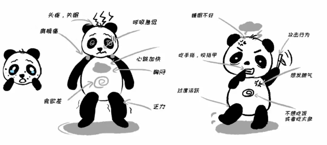 有些时候,情绪还会以其他的方式表现出来,比如头疼失眠、呼吸急促、肩膀疼痛、胸闷、心跳加快、容易生气、食欲差、乏力、不想吃饭或想吃得很多等。