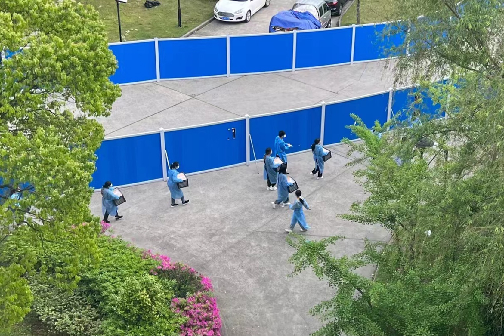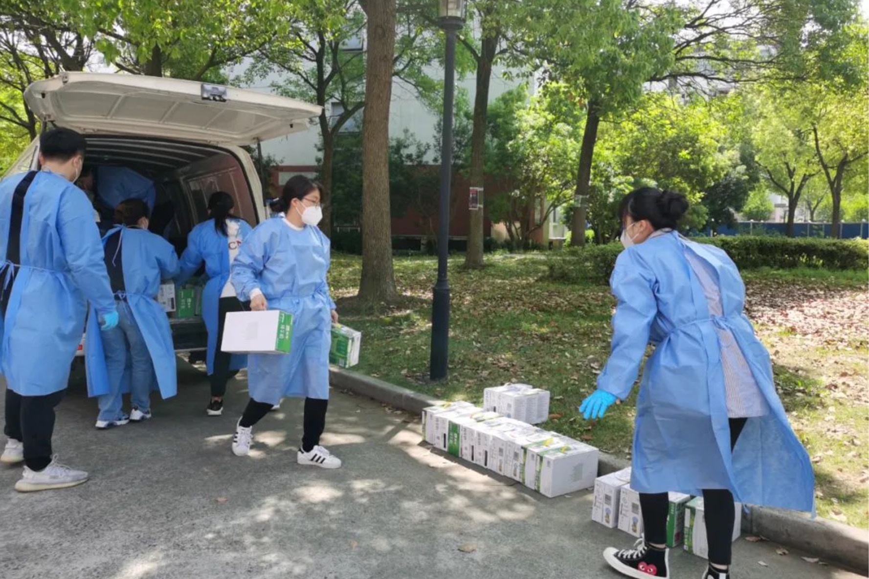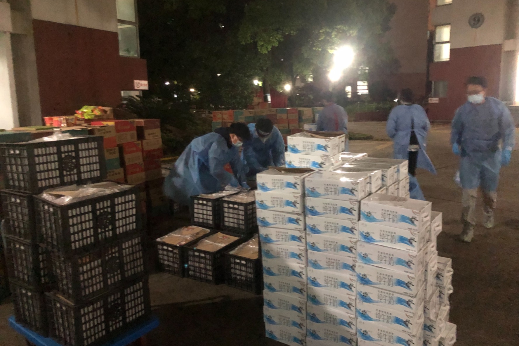 由于校园封闭管理,学校送来的所有物资全部依靠区块二的师生志愿者配送运至各楼栋。