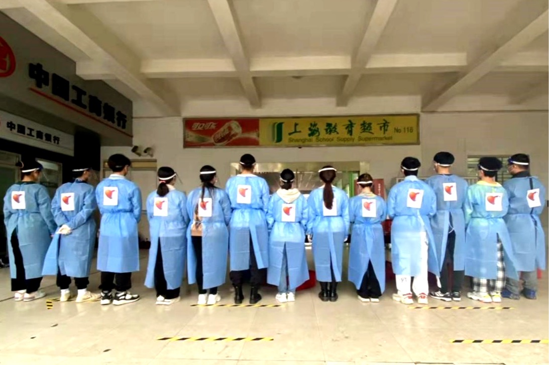 此时等待着我们的是一个全新的任务:在食堂协助售餐和维持秩序。因一天三餐都需要志愿者协助,任务量突然加大,胡增艳和查莎两位小伙伴便一起加入我们的“卖饭小分队”。我们五人便开始轮班协助老师负责研究生公寓北区的售餐工作。