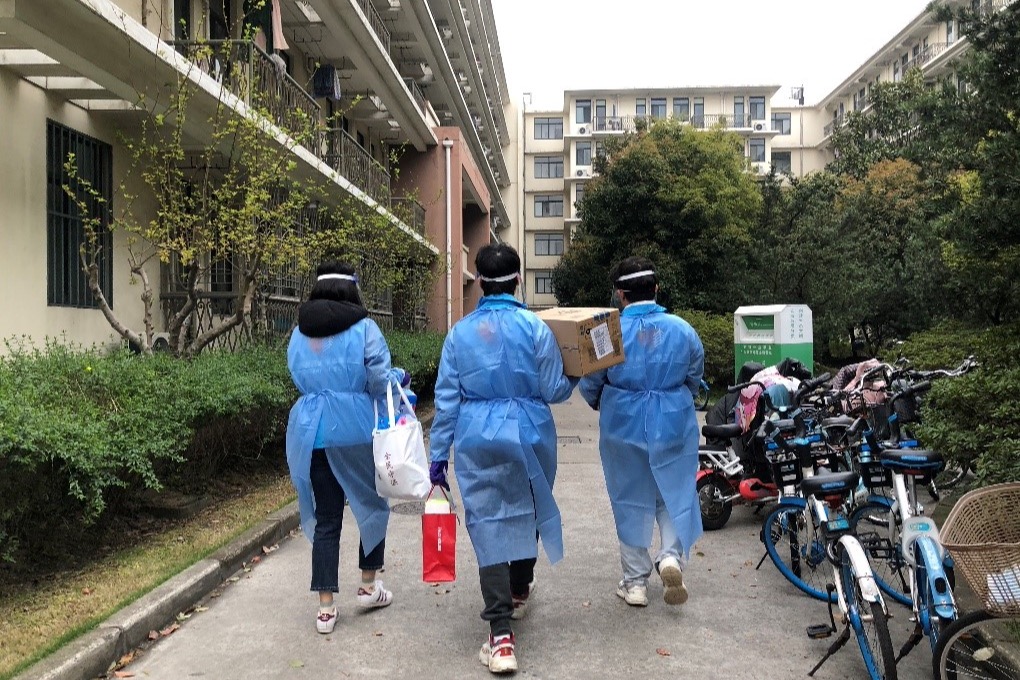 为楼内服务志愿者分发防疫物资(左起:吴潇宇、陈悦、纪晨毓、张铭荃)