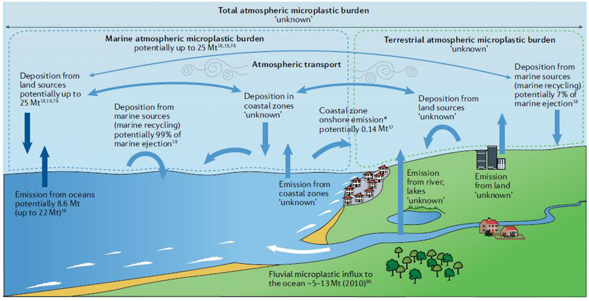 大气中微(纳米)塑料运输和海洋-大气交换的发现,表明了一个高度复杂的海洋塑料循环过程,同时也伴随着对生态系统和人类健康的负面影响。尽管如此,现有观测数据十分有限。这项研究量化了海洋-大气微(纳米)塑料循环的过程和通量,强调了大气微(纳米)塑料运输中存在诸多未解之谜。据研究估算,每年有0.013-2500万吨的微(纳米)塑料有可能在海洋-大气中运输并沉降到海洋之中。