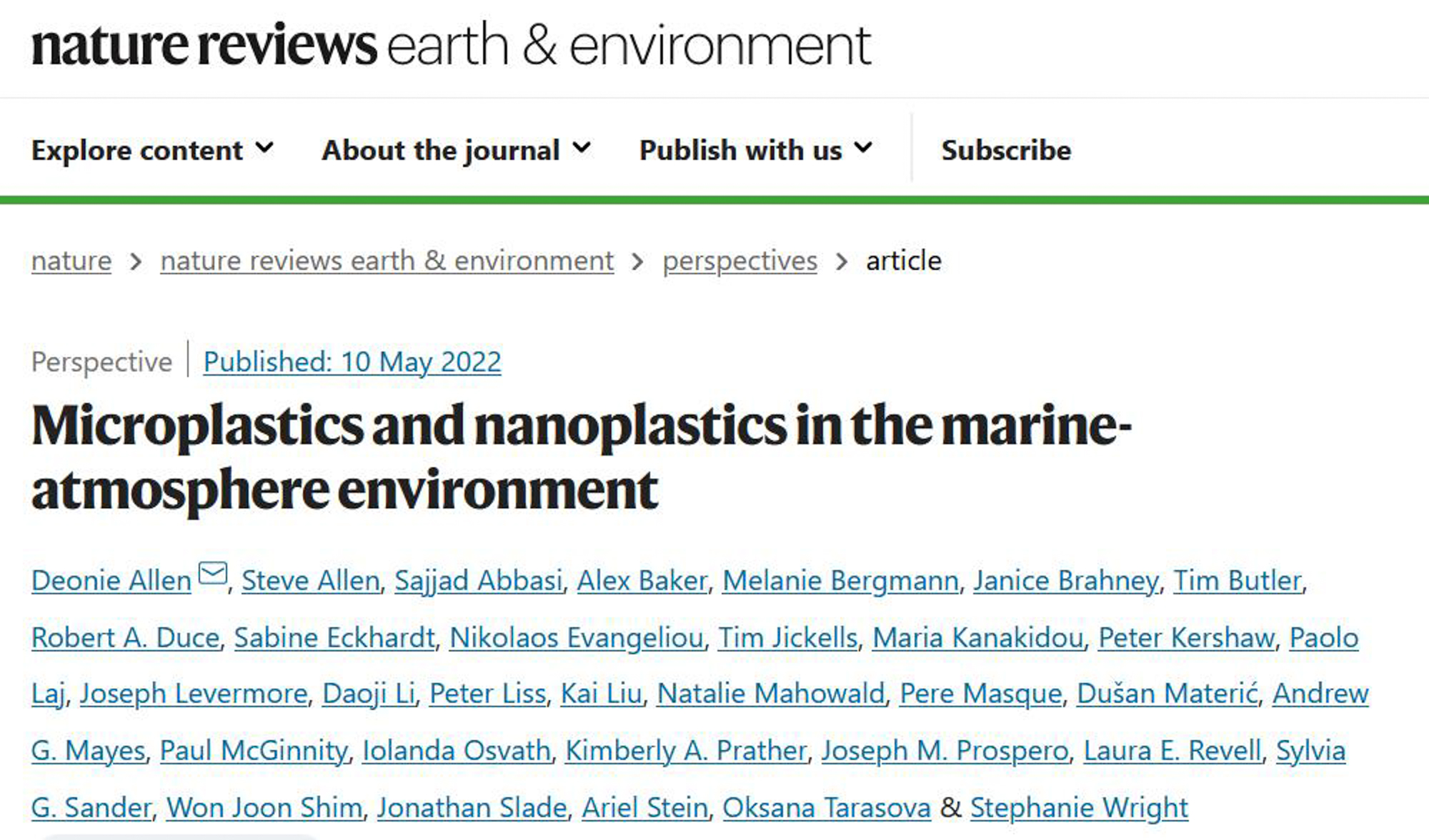 《自然》子刊《自然综述:地球与环境》刊发海洋-大气环境中微(纳米)塑料研究重要进展(原文出自:Deonie Allen et al.: Micro- and nanoplastics in the marine-atmospheric environment. Nature Reviews Earth & Environment (2022).)