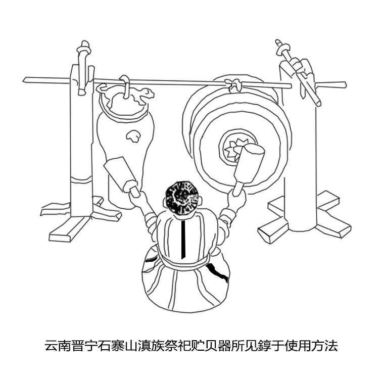 从已有的资料来看,錞于的演奏方式存在两种可能。在云南晋宁石寨山古墓(约当西汉时期)出土的铜贮贝器上,铸有大群滇人举行宗教仪式的场面。其中有两人合扛一木,下悬一錞于、一铜鼓、铜鼓侧悬,錞于则正吊于横木之上,旁有一人执棰并击之。为我们提供了生动的演奏图象。