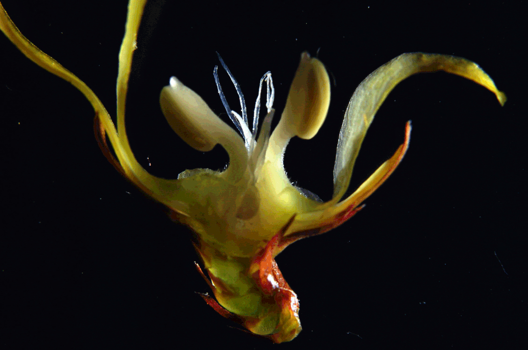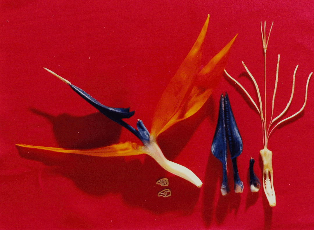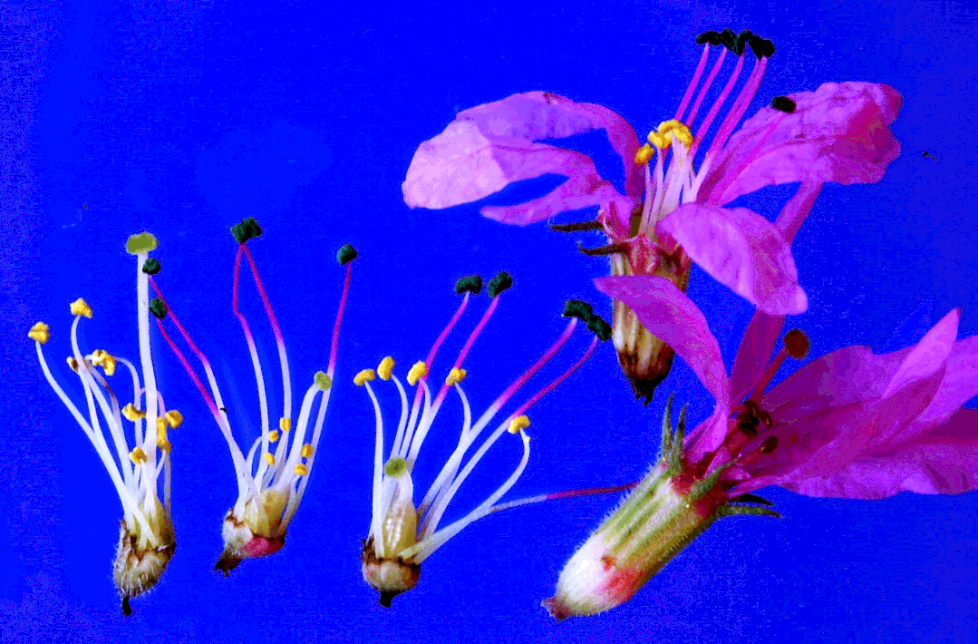 模拟蜂鸟到来,受重力所压,花瓣(紫色)分开露出花粉。我国没有这样的鸟类,画图以表示。