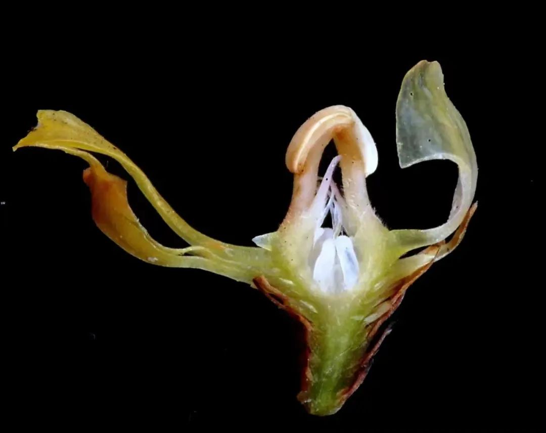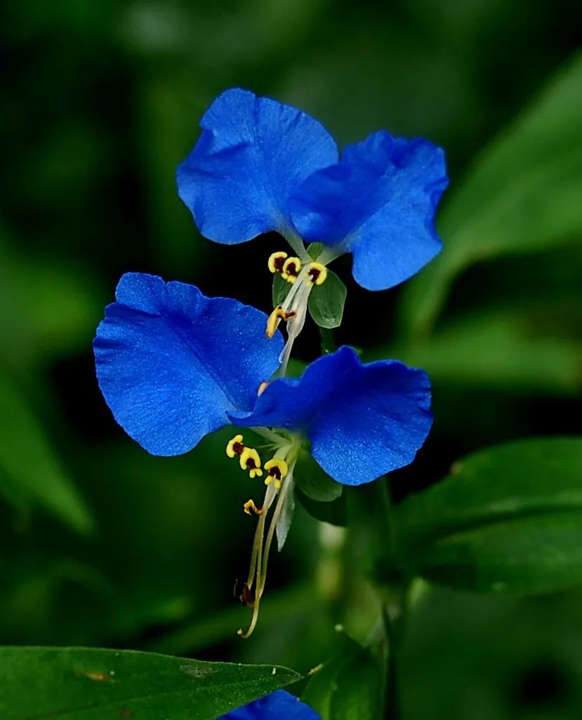 2片蓝色花瓣招引昆虫前来,昆虫来到以后受黄色退化雄蕊的指引采食蜜汁。