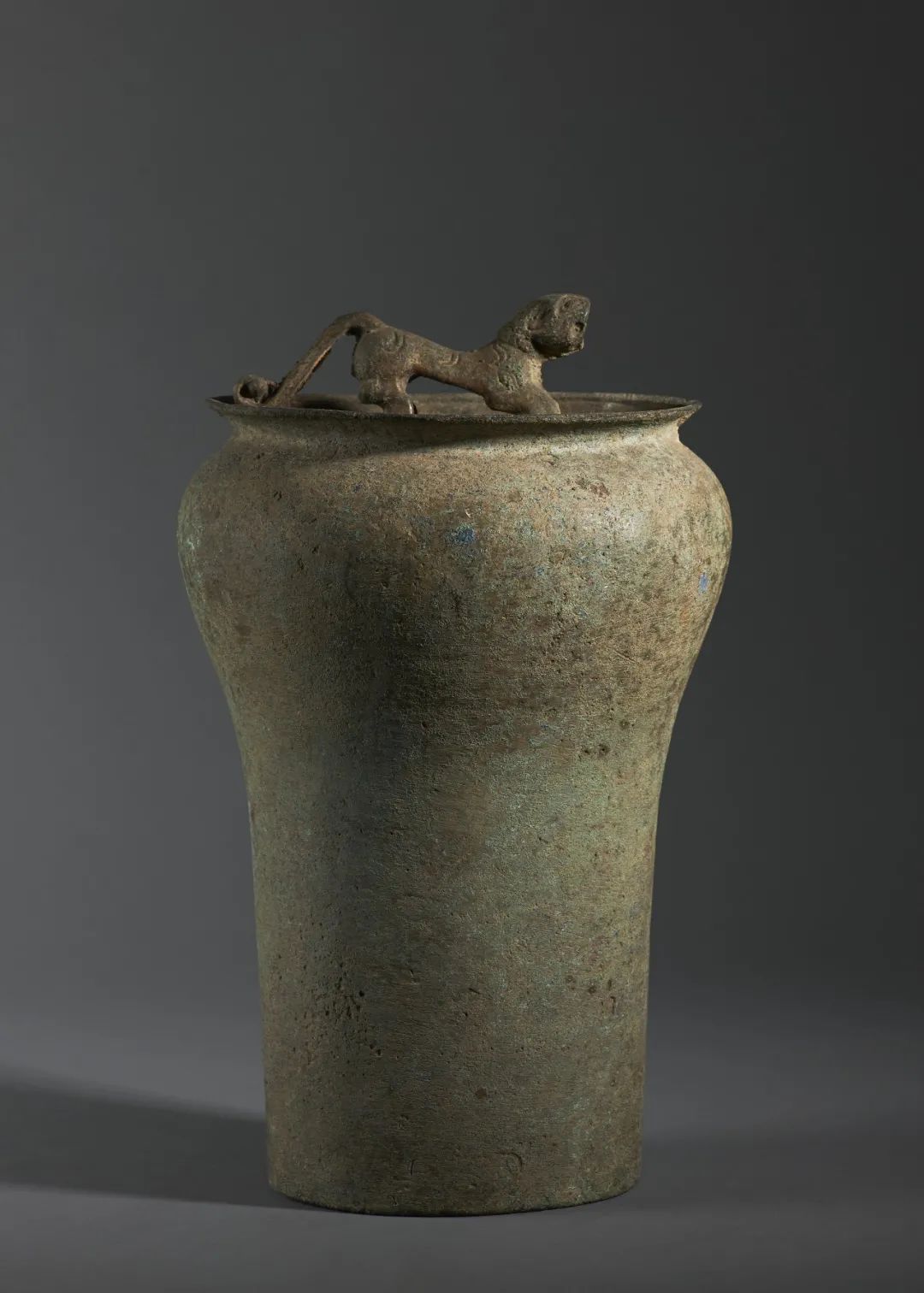 錞,又作錞于,铜制军中击打乐器,常与鼓相配,用于战阵。目前发现最早的作于春秋时期,盛于汉代。形如圆筒,上大下小,中空,顶上多作虎形钮,可悬挂。——《澳门永利皇宫官网入口博物馆精品图集(一)》
