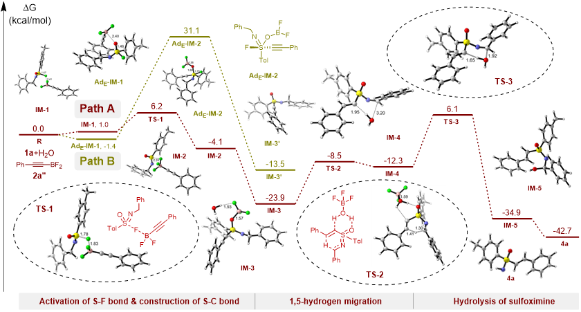 基于长期的硫化学积累,针对上述高氧化态硫SuFEx链接存在的挑战性问题,姜雪峰、王明团队开发了氟代砜亚胺与TMS-炔的调控SuFEx链接化学。当氟代砜亚胺的N-取代基是具有氢转移能力的苄基时,可快速链接构建S(VI)-C(sp2)键;当氟代砜亚胺的N-取代基是对甲苯磺酰基时,通过SuFEx链接则构建S(VI)-C(sp)键(图2)。该链接基于硅-氟的强结合能 (BDE = 135 kcal/mol),通过三氟化硼作为氟转移试剂,协同实现S(VI)-F键断裂和Si-C键活化。氘代跟踪实验表明反应通过分子内1,5-氢迁移将炔烃还原成烯烃。竞争实验表明苄位上存在供电子基团(如甲基)时,有利于加速1,5-氢迁移。DFT计算验证反应通过三氟化硼乙醚与硅基封端的苯乙炔现场生成二氟化硼苯乙炔中间体来活化氟代磺酰亚胺的S-F键,进而形成砜亚胺阳离子,与活化后的苯乙炔加成实现S-C键构建,再经过分子内1,5-氢迁移和水解脱除苯甲醛获得砜亚胺(图3)。