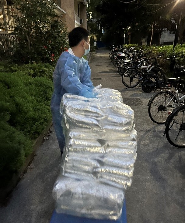4月1日上午,已经封闭管理了19天核酸全阴的研究生公寓北区首次出现核酸异常,由于涉及食堂工作人员,当天的午晚餐全部从片区外临时紧急调配,工作组的7位老师(黄岚兰、杜震宇、刘金玉、黄天翔、于袁欢、杜源恺和我)承担起了当天为片区内近2700人送餐的工作。