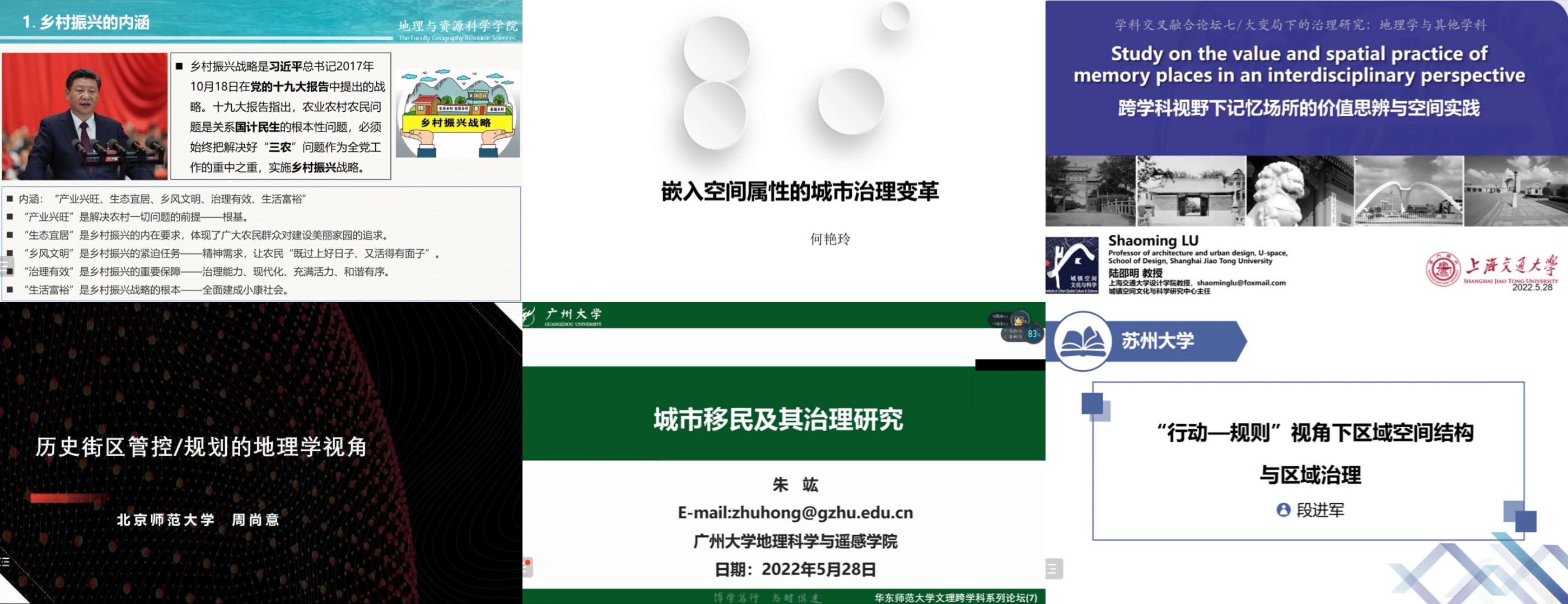 四川师范大学邓伟教授、中国人民大学何艳玲教授、上海交通大学陆邵明教授、北京师范大学周尚意教授、广州大学朱竑教授和苏州大学段进军教授应邀出席并作主题报告。六位专家分别从地理学、管理学、建筑学、规划学、经济学等多个学科视角切入,围绕治理的相关问题,深入探讨了山区国土空间治理与乡村振兴的战略步骤,分析了城市治理中的“空间”属性问题,中国语境下记忆场所的价值和空间实践,并就历史街区的规划与治理问题展开对话,聚焦地方性与主体性行为,剖析了当前中国移民问题的多样性与治理的路径选择,基于“行动—规则—秩序”三位一体的理论范式解读了区域空间结构演化及其发展与治理等具体命题。