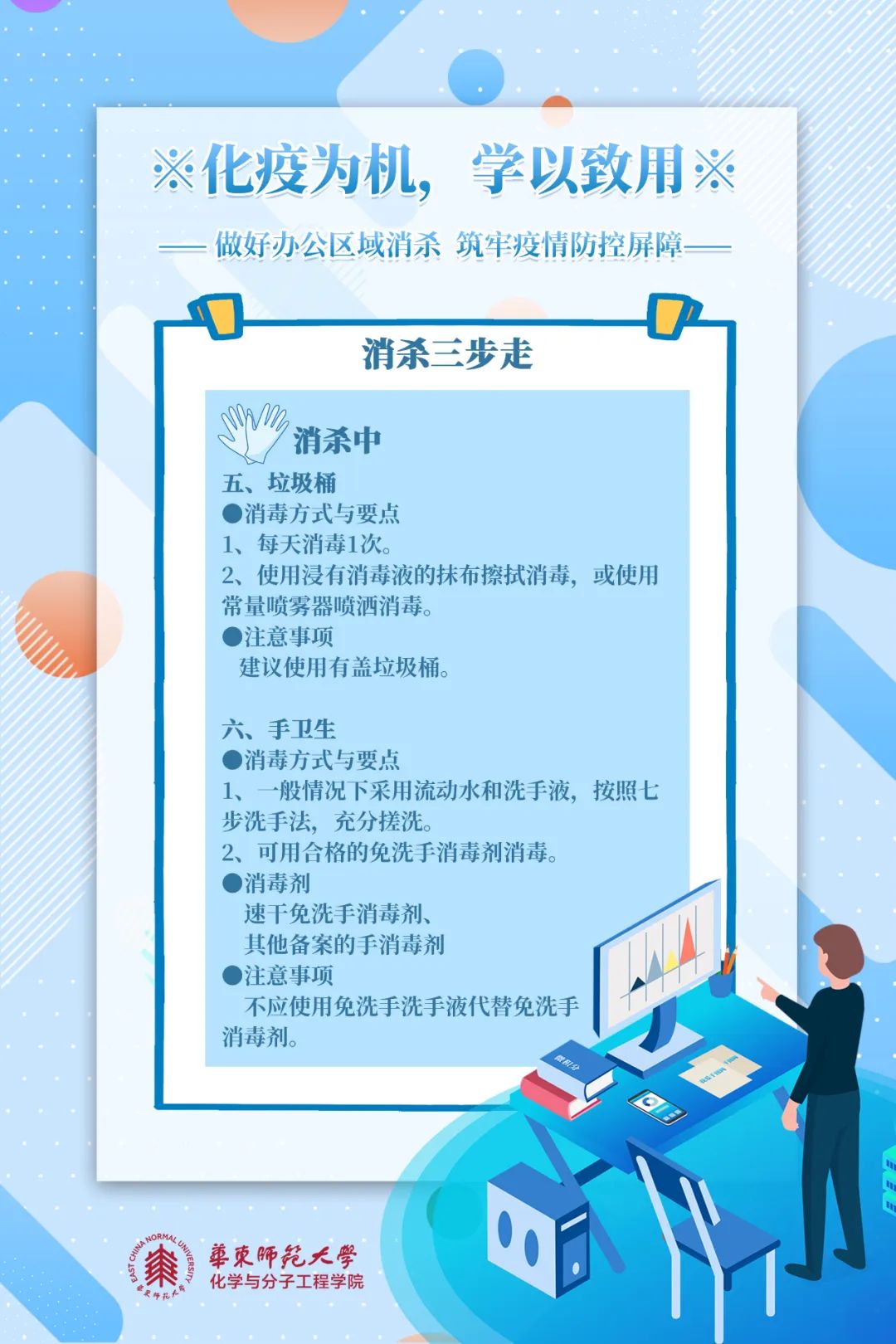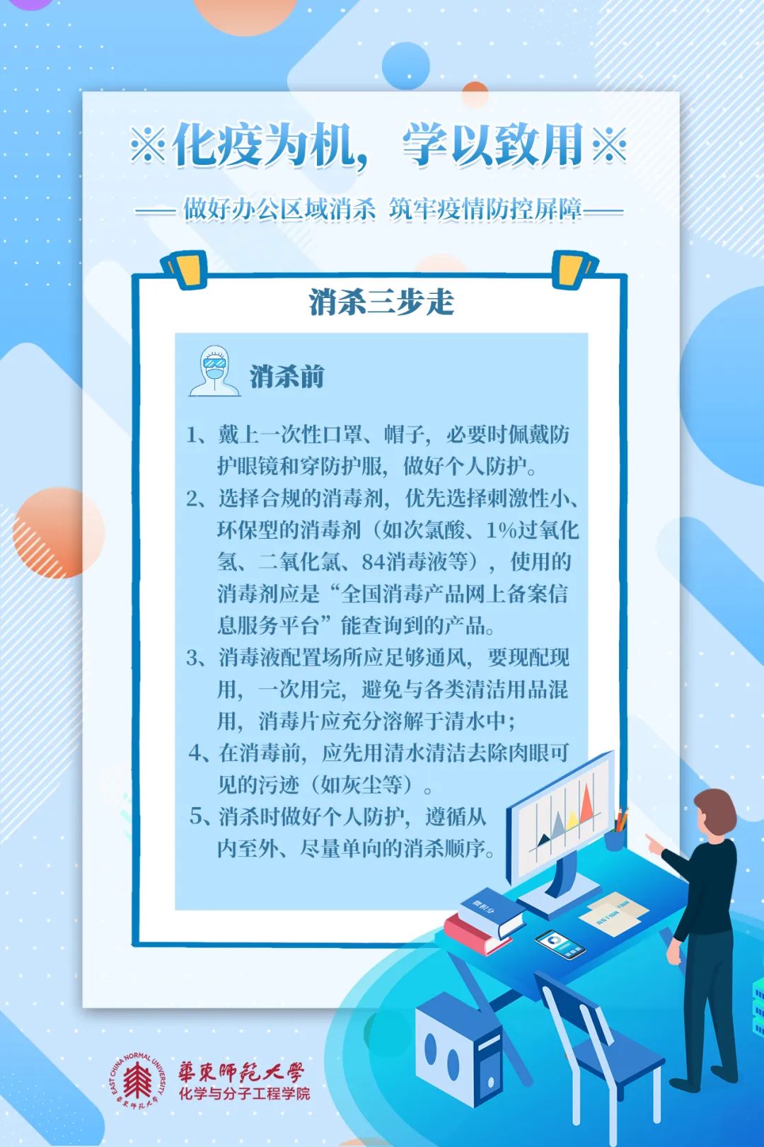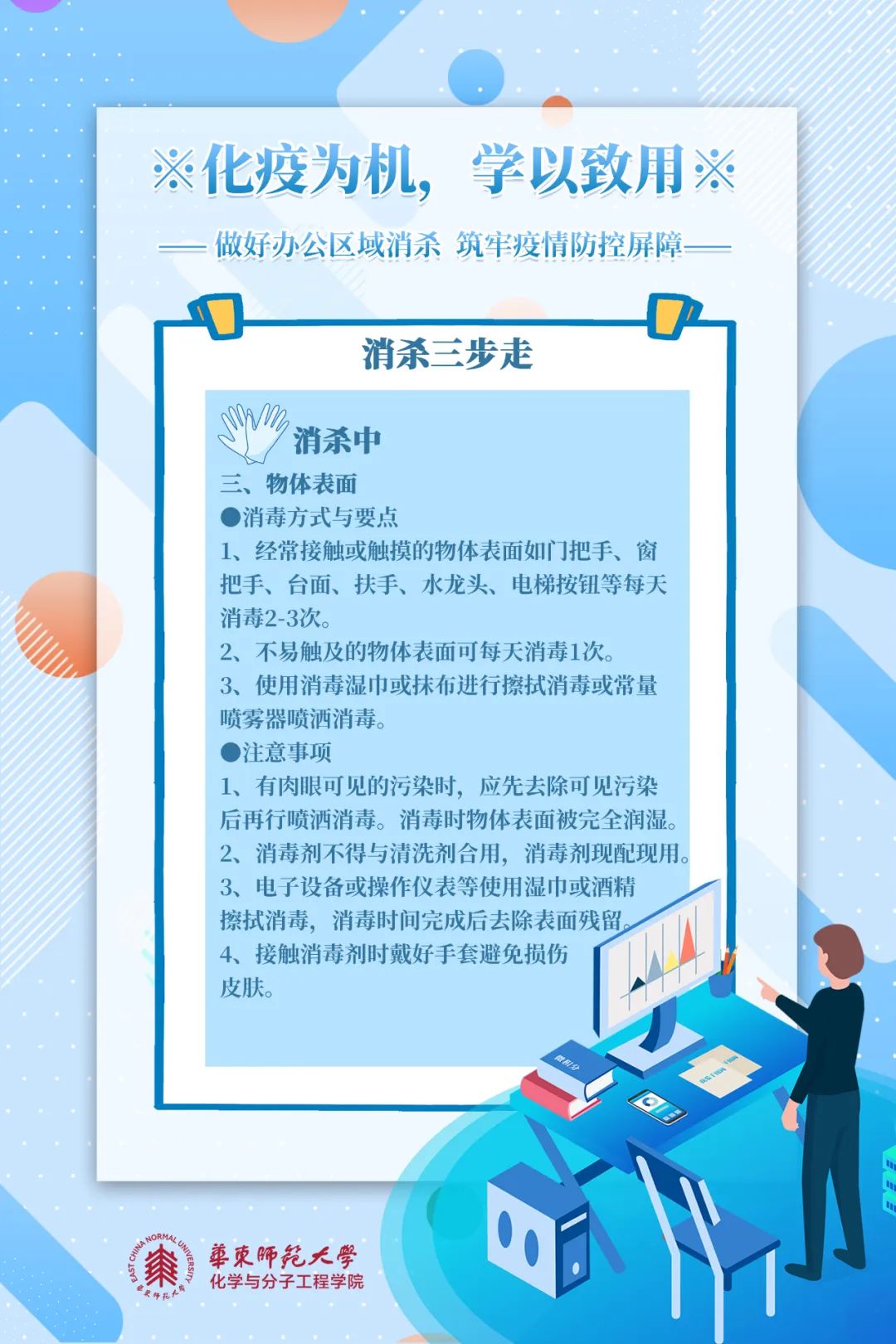 消杀五原则是什么?如何完成办公区域消杀?跟着化学与分子工程学院8张海报学起来!