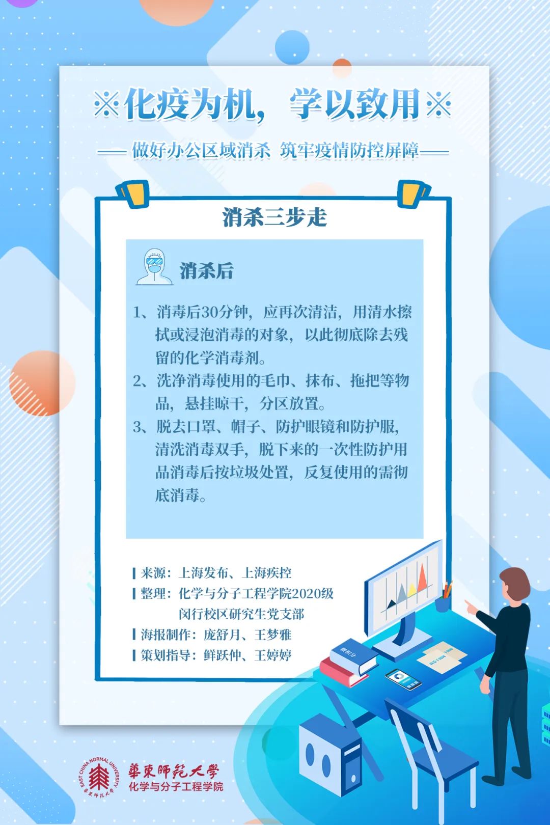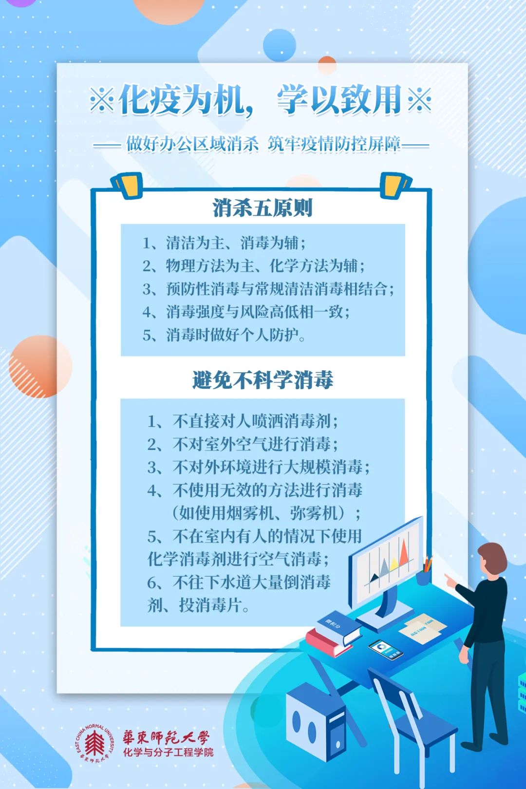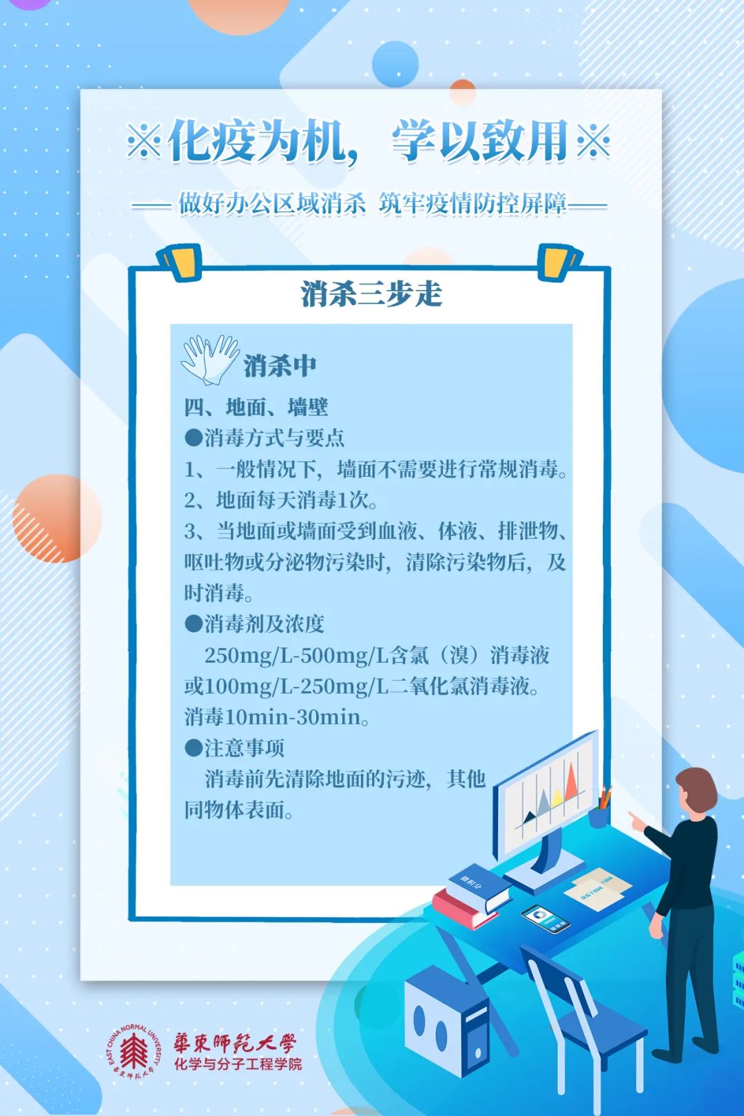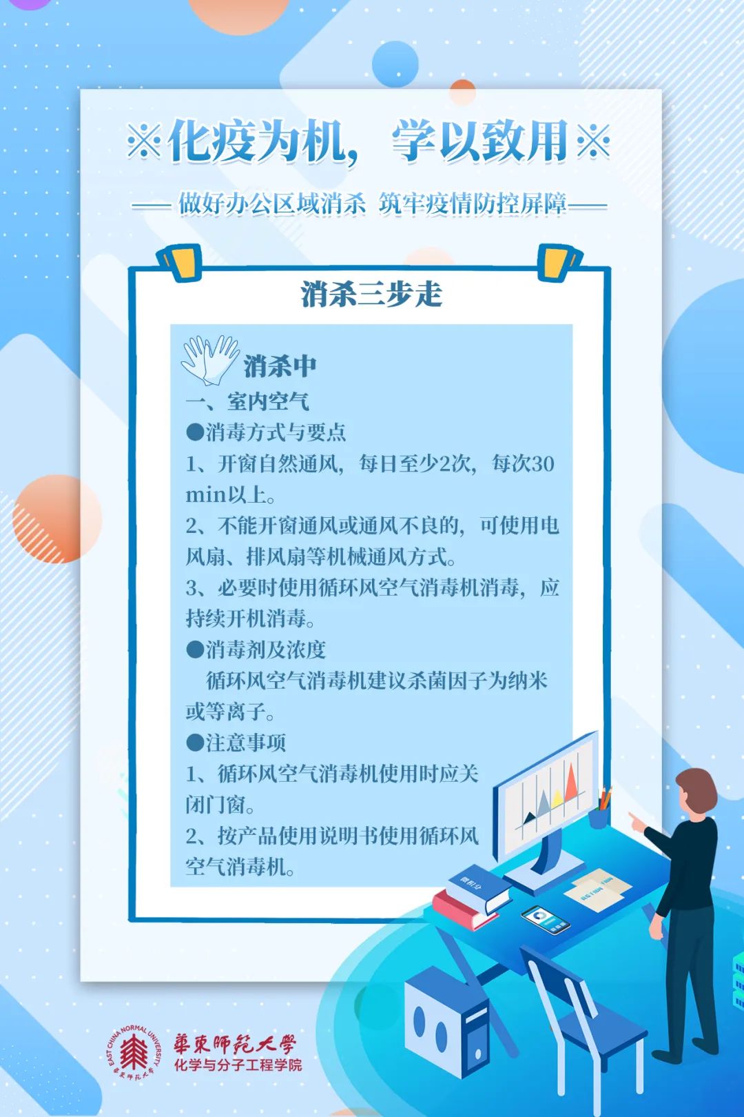 消杀五原则是什么?如何完成办公区域消杀?跟着化学与分子工程学院8张海报学起来!