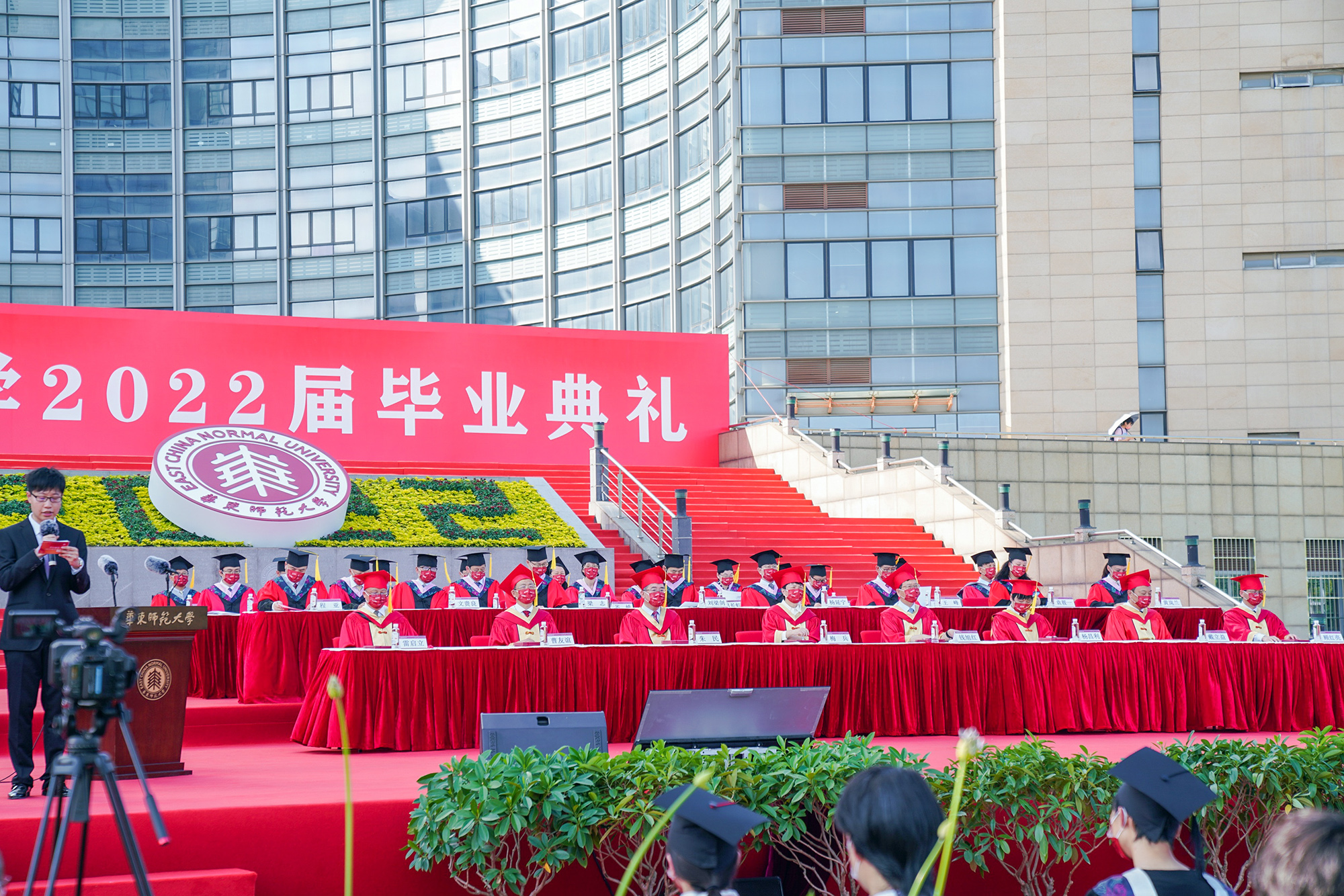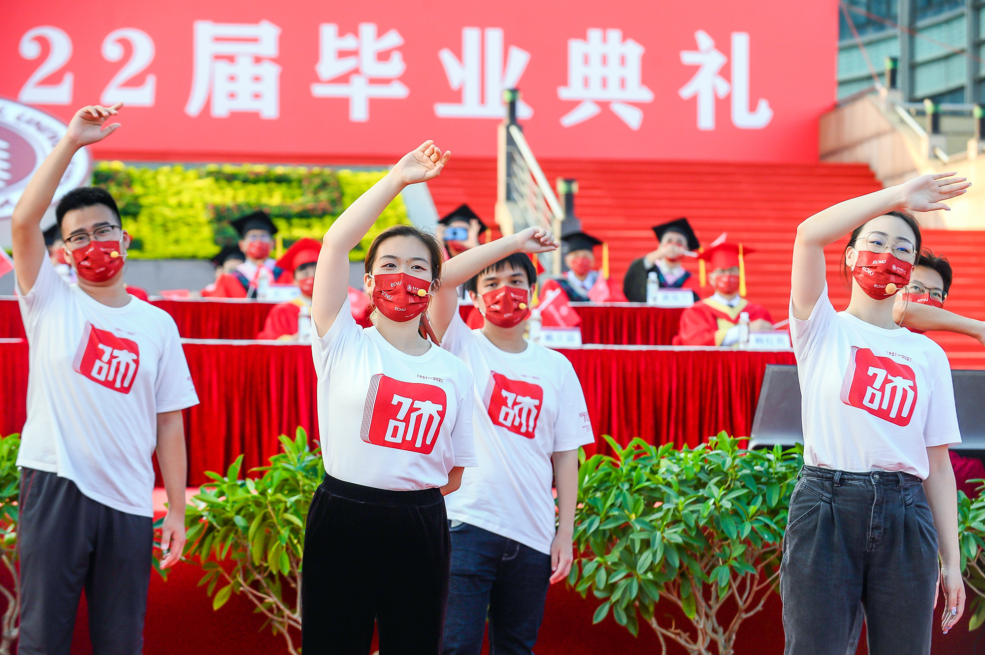 华东师大2022届毕业生线上线下欢聚一堂。毕业典礼由在校参加战疫的师生志愿者一起主持,一直坚守在防疫第一线、守护和陪伴毕业生共克时艰的宿管阿姨、食堂大厨、保安叔叔等后勤员工代表也到场欢送毕业生迈向新征程。