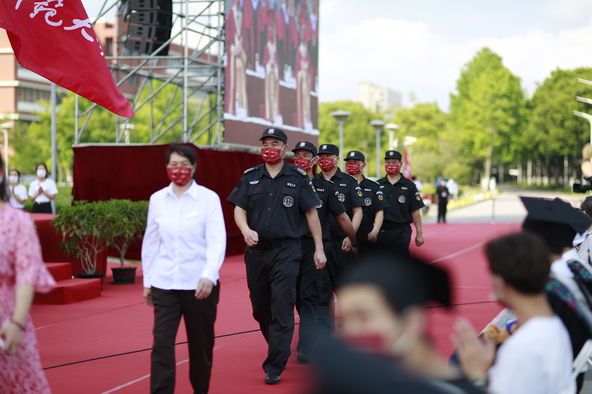 守护和陪伴毕业生共克时艰的宿管阿姨、食堂大厨、保安叔叔等后勤员工代表也到场欢送