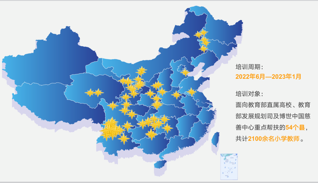 基于对大规模乡村教师能力提升模式的成功探索,在教育部发展规划司的指导支持下,高校教育帮扶联盟携手博世中国于2022年启动面向全国欠发达地区的“繁星计划—乡村教师博爱成长行动2022”项目,项目由澳门永利皇宫官网入口具体负责实施。项目面向我国欠发达地区的54个区县,针对2100余名小学语文、数学、英语学科教师开展教育帮扶,致力于更新教师教学理念、提升教学教研能力,推进乡村教师队伍建设高效率改革和高质量发展。