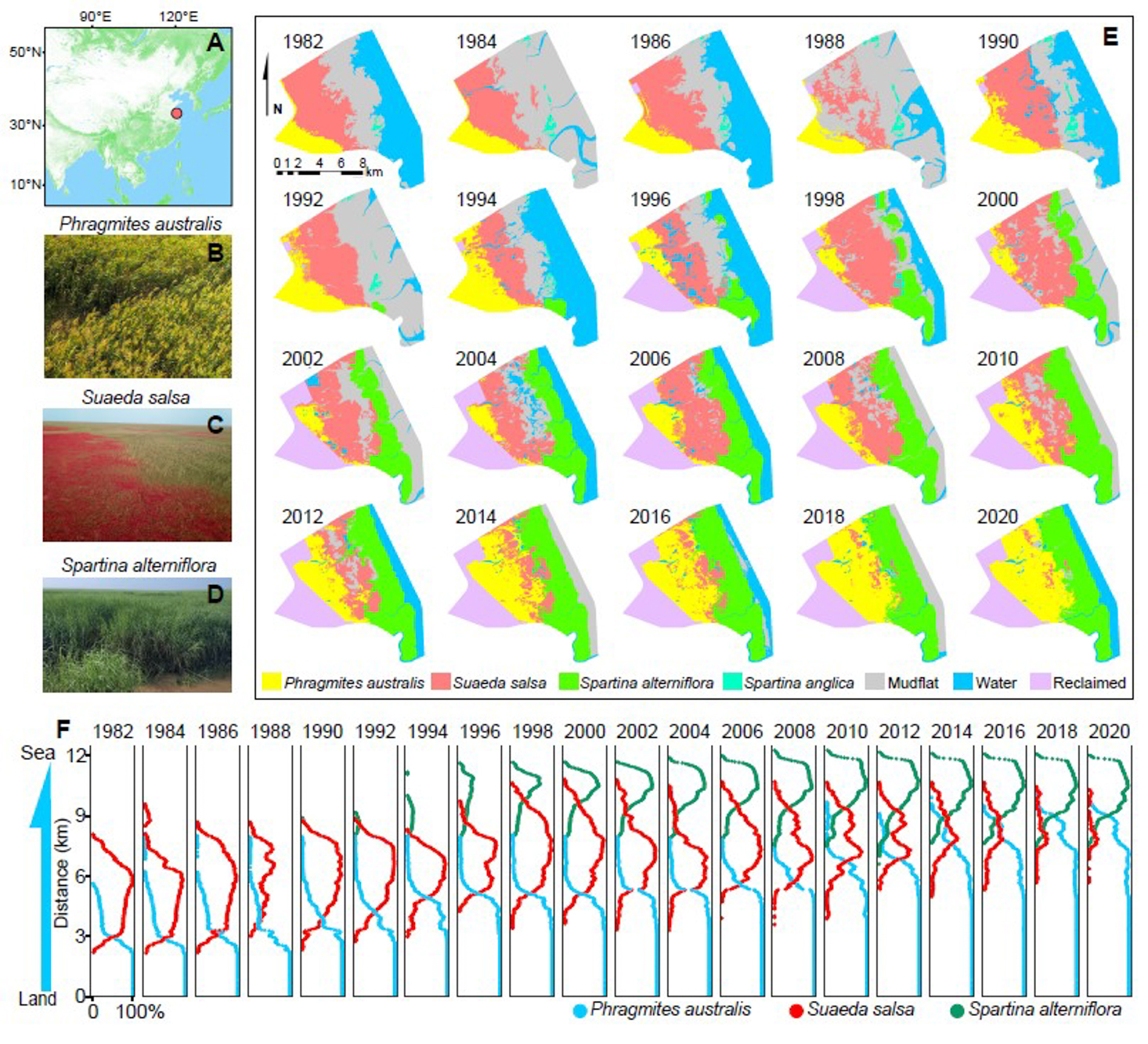 研究团队首先通过解译江苏盐城湿地珍禽国家级自然保护区核心区40年的Landsat遥感影像(图2),发现在互花米草定殖并占据低潮位区域后的5年后,中潮位的盐地碱蓬群落面积开始表现出快速萎缩趋势。有趣的是,碱蓬盐沼的萎缩并非由外来种互花米草直接侵占,而主要是由高潮位的本地种芦苇扩张侵占导致。