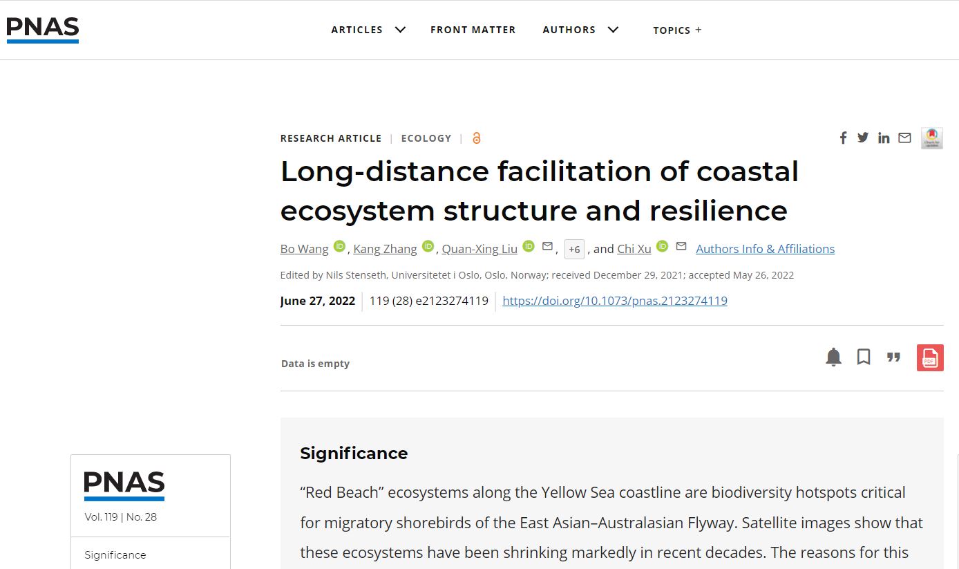 该研究于2022年6月27日以“Long-distance facilitation of coastal ecosystem structure and resilience”为题在线发表于《美国科学院院刊》(PNAS)。南京大学博士生王博和澳门永利皇宫官网入口博士生张康为论文共同第一作者,澳门永利皇宫官网入口刘权兴教授和南京大学徐驰教授为论文共同通讯作者,复旦大学贺强教授、荷兰皇家海洋研究所Johan van de Koppel教授、美国布朗大学Mark Bertness教授等国内外研究者共同参与本项研究。