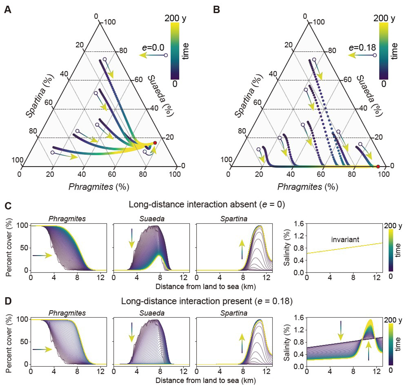 图3.模型分析揭示长距离相互作用对滨海湿地生态系统的影响。图中参数为长距离相互作用强度系数。图A、C和图B、D分别显示长距离相互作用缺失和存在时生态系统的稳态和瞬态。