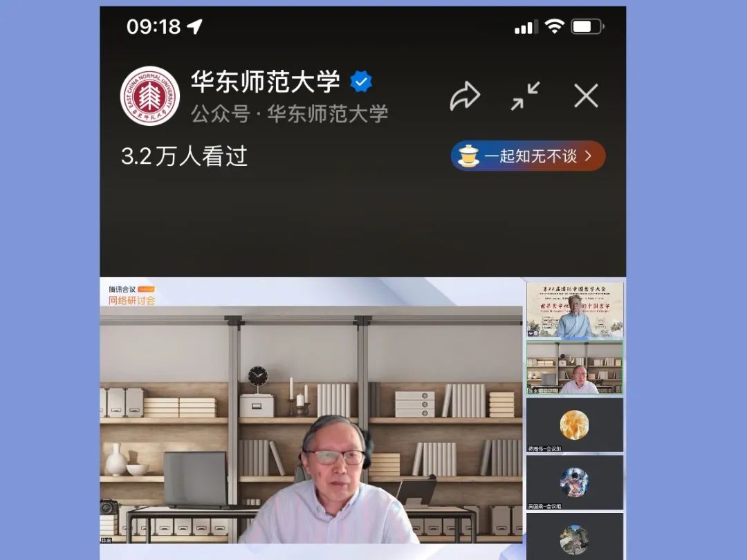 记者注意到,开幕式尽管在腾讯会议室的网络会议室举办,不过,有近60位学者被设为嘉宾身份,他们拥有音频、视频权,技术带来仪式感,线上大合影也蔚为壮观;其余有400余位学者和听友有序地在听友通道内;而同步直播的华东师大微信公众号、视频号和B站华东师大号,均有几万听友直接暖屏,上午的全体大会与下午的特邀专场的两场直播分别达到了9.3万和10.7万。在这一天的大会发言、特邀会议、平行会议中,在嘉宾通道里,记者几乎见到了所有平时想见而迫于时空限制无法见到的海内外业内大牌学者。