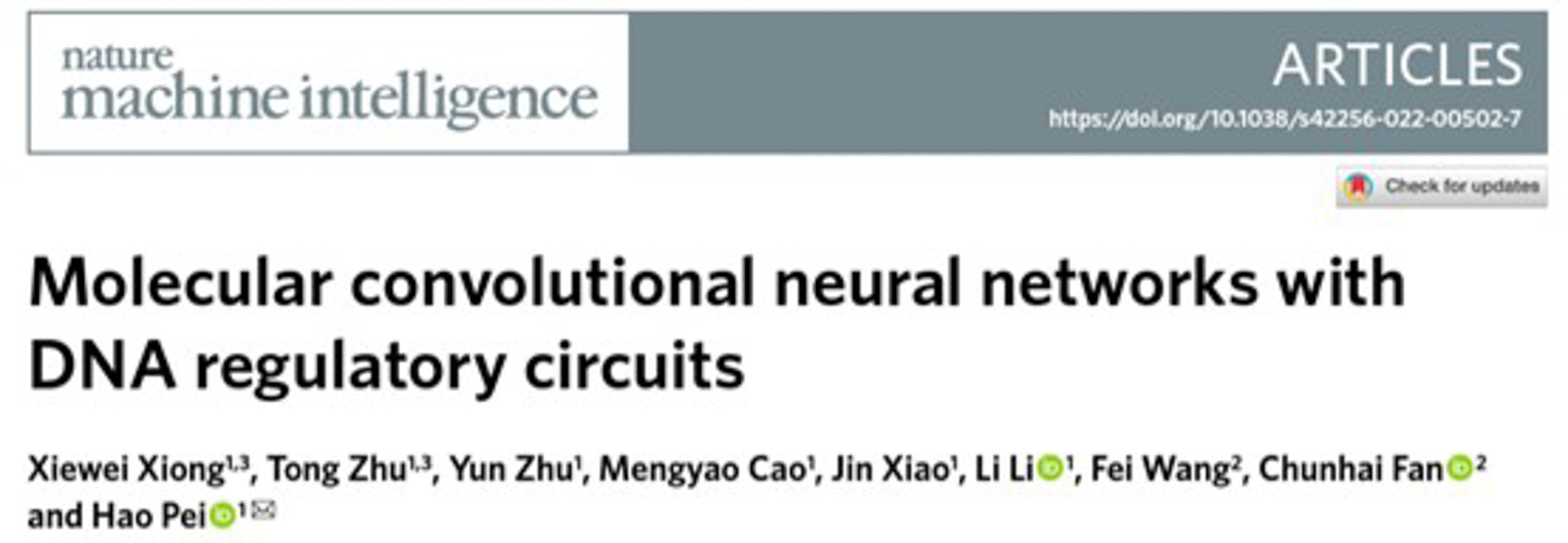 研究成果以“基于DNA调控电路的分子卷积神经网络(Molecular convolutional neural networks with DNA regulatory circuits)”为题,于2022年7月4日在《自然﹒机器智能》(Nature Machine Intelligence)上发表。熊谢微博士和朱通副教授为论文的共同第一作者,朱通老师课题组负责卷积计算模型设计及优化,裴昊教授为通讯联系人。