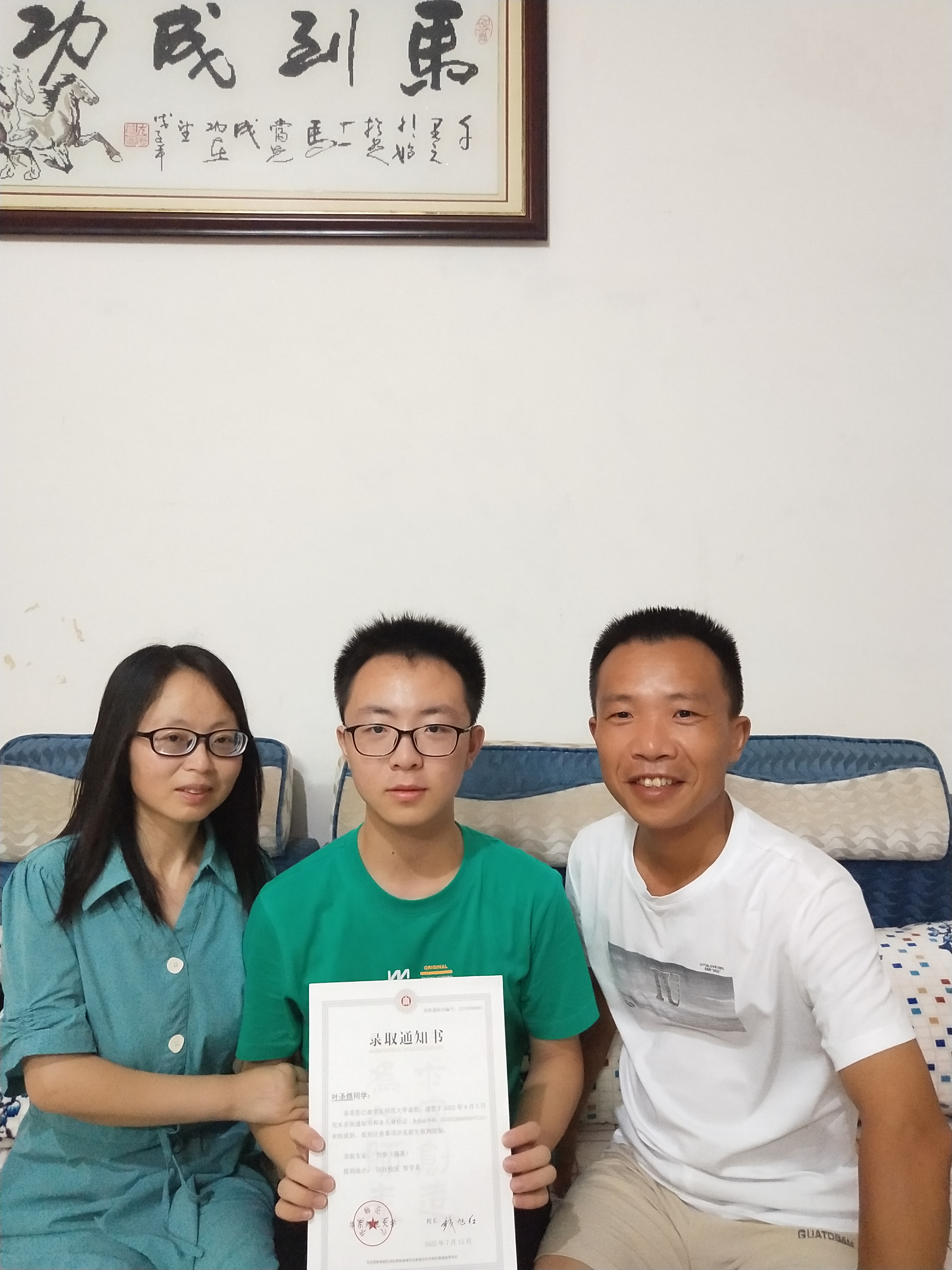 叶圣煜同学和父母在家中收到0001号录取通知书