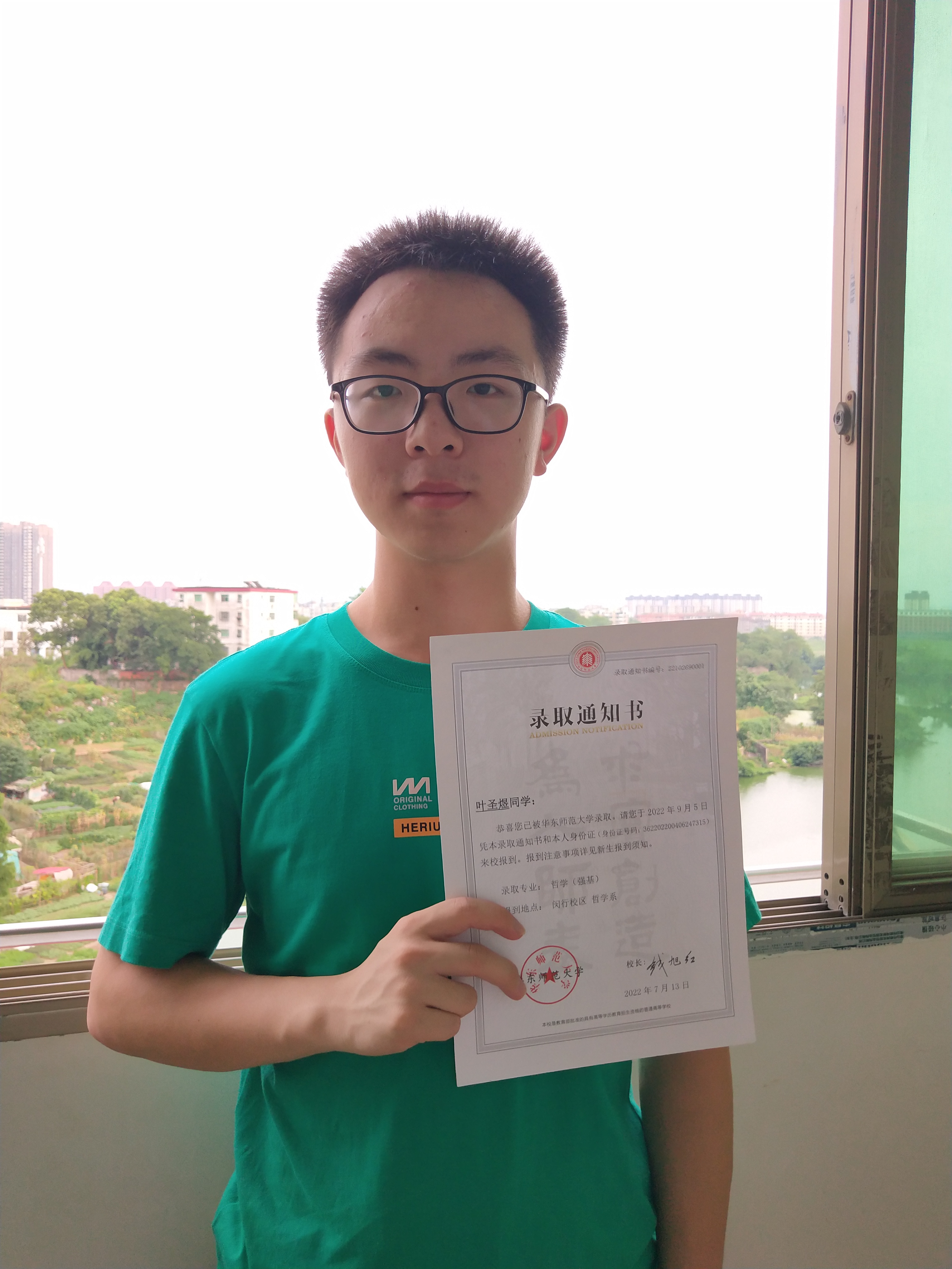“当时分数出来后,专业的选择依然考虑哲学、中文等人文学科。”叶圣煜说,“哲学其实是我一直想学的。我很清楚地知道大多数人对哲学的看法,但我不以为然。许多大学都没有哲学这个专业,只有名校才有。” 叶圣煜得知成绩后,迫不及待地向师友“解读”自己的人生选择。