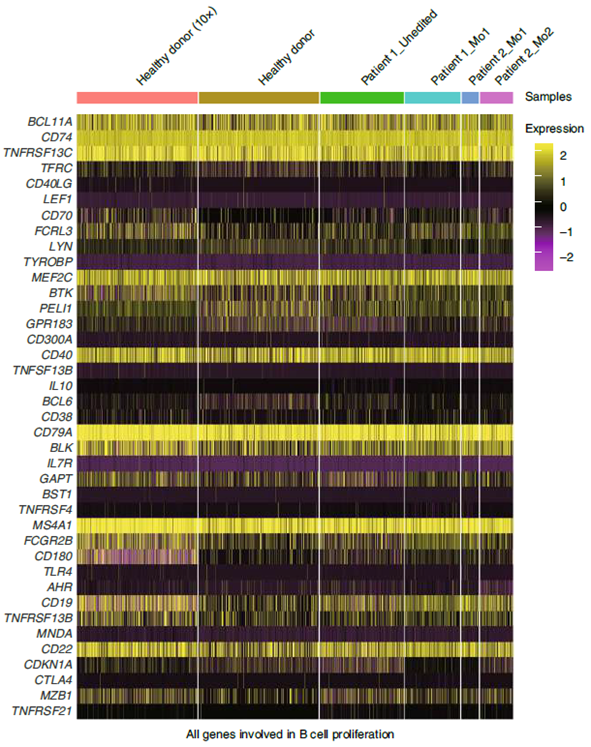 健康供体和经基因编辑后病人的B细胞簇中B细胞增殖相关基因的表达