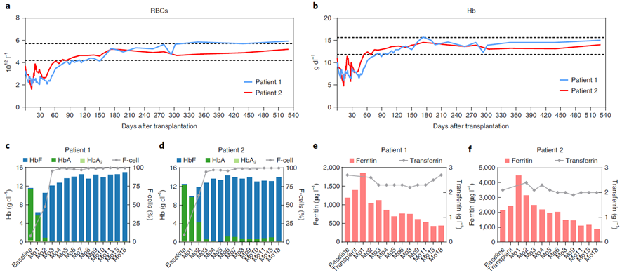 截至文章投稿时,两例患者在治疗后都实现了脱离输血依赖超过16个月,脱离输血依赖的定义为为输血的情况下总血红蛋白达到或超过90g/L。移植后第9个月时的骨髓细胞中的编辑率分别为85.46%和89.48%。