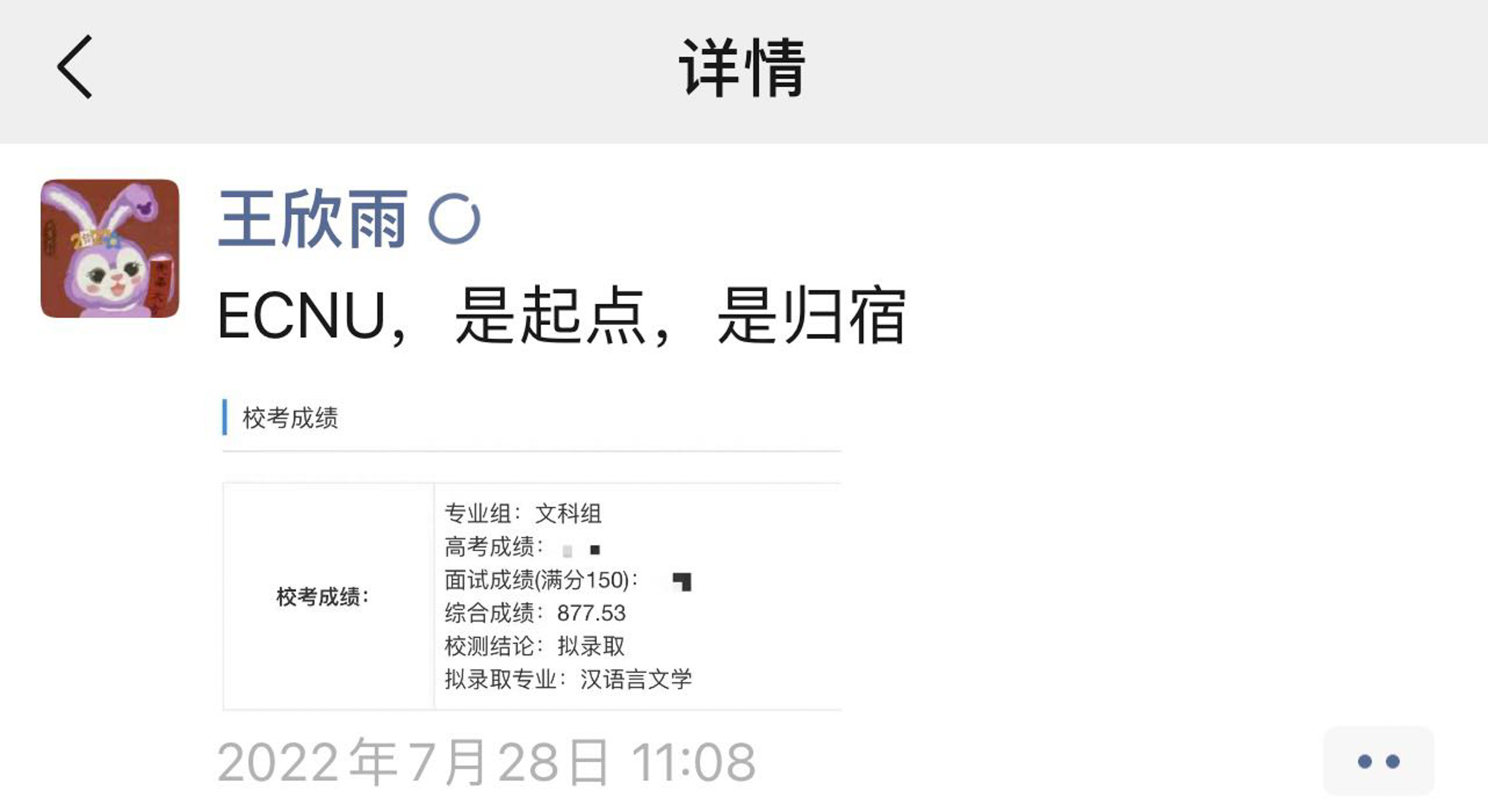 在这样的“双向奔赴”下,王欣雨逐步坚定的梦想,以华东师大汉语言文学(古文字学)专业作为求学之路上的新起点,“心之所向,一苇以航”。在确认被澳门永利皇宫官网入口录取后,王欣雨在朋友圈写下“ECNU,是起点,是归宿”,开启新的人生之旅。