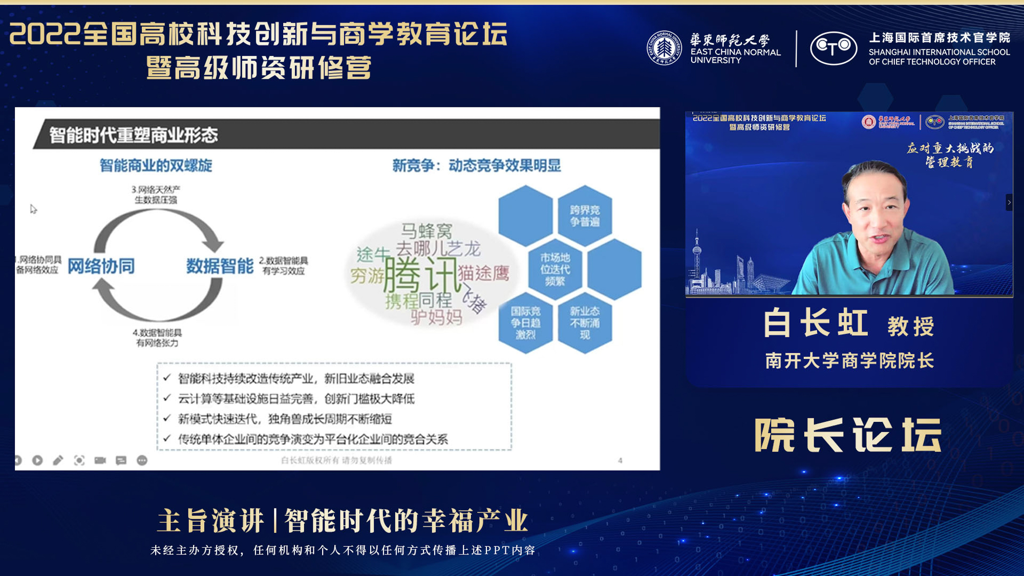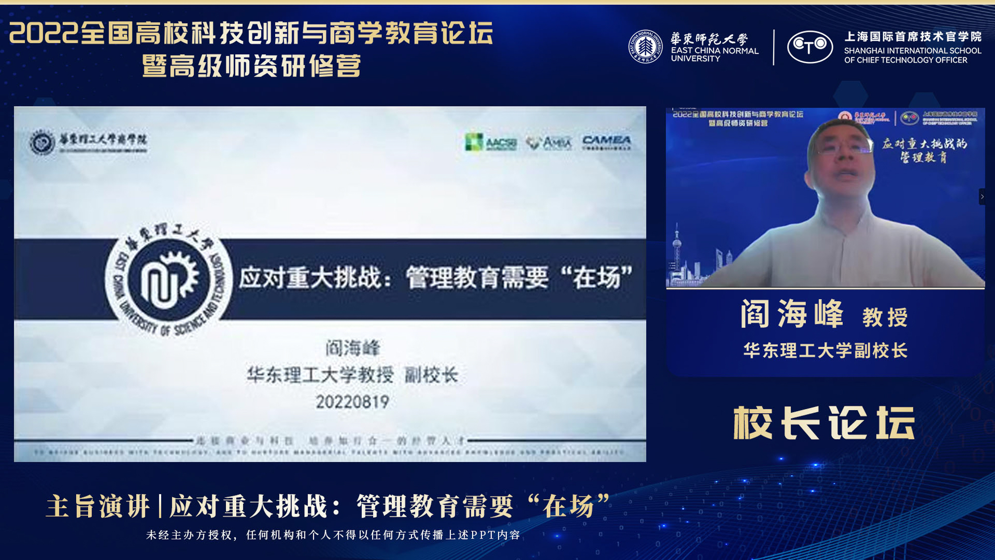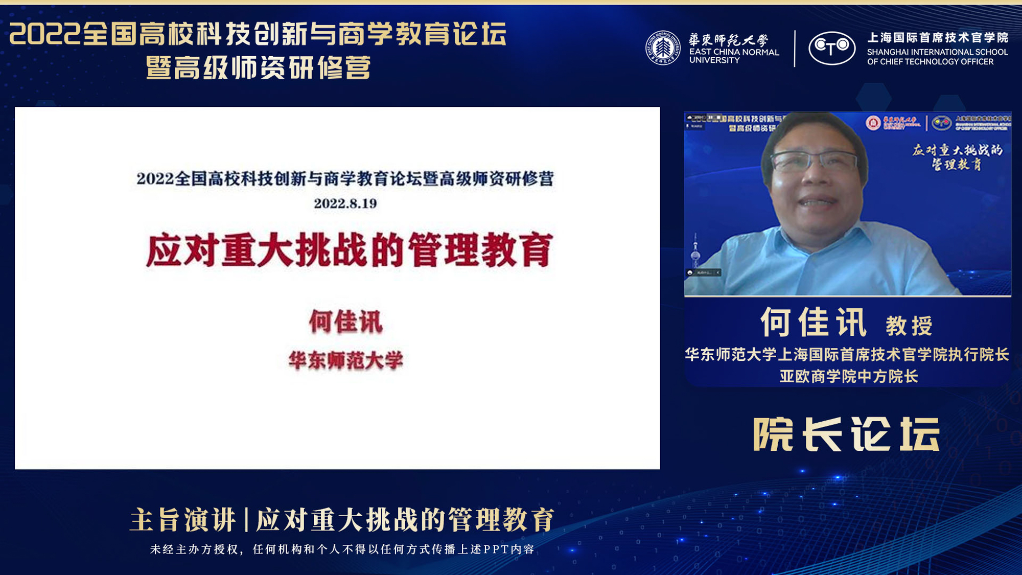 由澳门永利皇宫官网入口主办的“第二届2022全国高校科技创新与商学教育论坛暨高级师资研修营”8月19日在线举行,以“应对重大挑战的管理教育”为年度主题,邀请国内外高校一流专家发表主旨演讲并进行专题授课。首日论坛直播吸引了近8万人次收看。澳门永利皇宫官网入口党委常委、副校长顾红亮教授、澳门永利皇宫官网入口校长助理吴瑞君教授分别主持上午的校长论坛和下午的院长论坛。