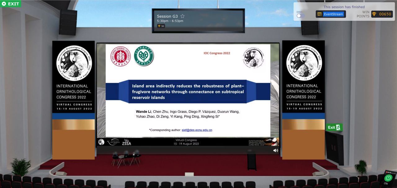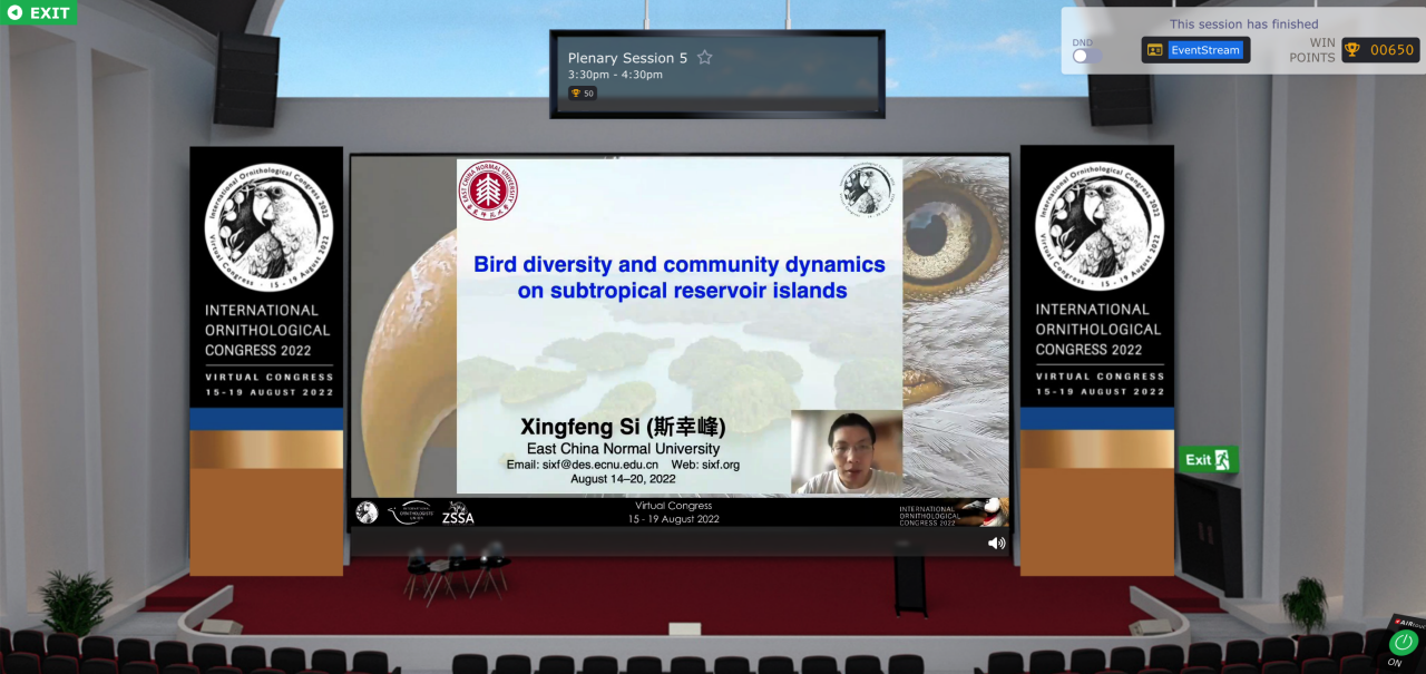 斯幸峰研究员作为我国首位受邀在IOC作大会报告的青年鸟类学者,以“Bird diversity and community dynamics on subtropical reservoir islands”为题进行汇报。该报告从物种丰富度、群落结构和种间关系等方面,系统介绍了斯幸峰课题组依托浙江千岛湖人工陆桥岛屿模式研究平台长期开展的鸟类多样性与群落动态的研究工作。