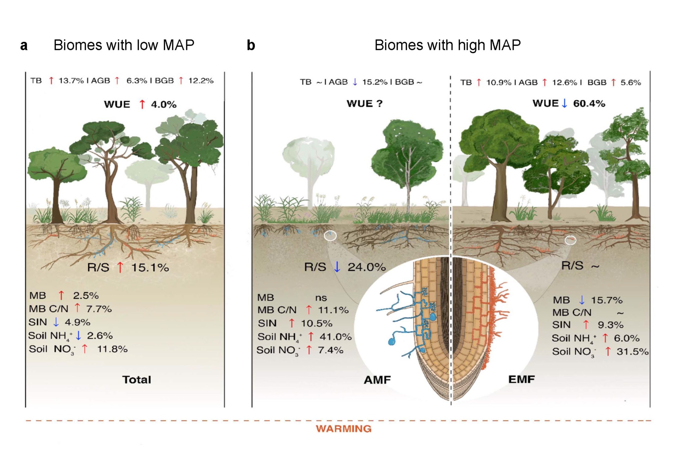 降雨水平与菌根类型共同调控植物地上-地下生物量对增温的响应