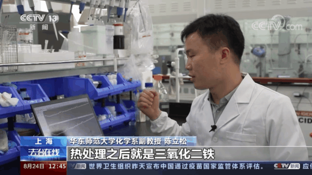 在华东师大化学系副教授陈立松看来,它与氧化铁的主要的峰是完全吻合的,证明我们得到的这样一种黄褐色的物质,热处理之后就是三氧化二铁,也就是我们家里常见的铁锈的主要成分。