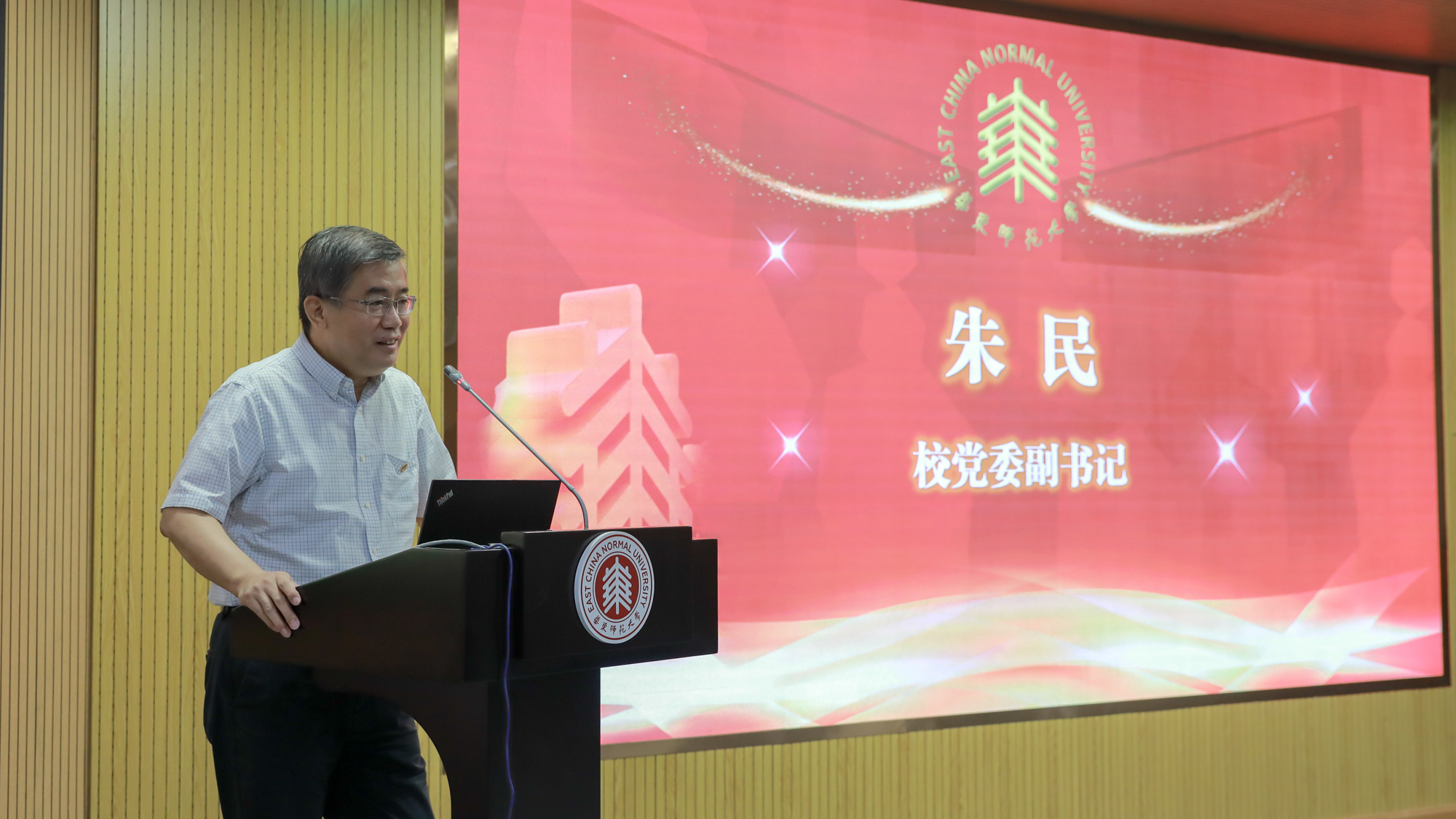 华东师大第33期新入职教职工培训开班典礼于8月29日在普陀校区图书馆二楼报告厅举行。校党委副书记朱民,“创获智慧”中国哲学教学与研究团队(全国高校黄大年式教师团队)负责人杨国荣,教务处处长孟钟捷,研究生院常务副院长吴健,教师发展学院党总支书记赵健,机关党委副书记张军,人事处处长兼党委教师工作部部长濮晓龙,党委教师工作部常务副部长卢波、副部长方金奇及全体参训教职工出席了本次开班典礼。按照疫情防控相关规定,本次开班采用线下和云端直播同步的方式进行。典礼由人事处处长兼党委教师工作部部长濮晓龙主持。